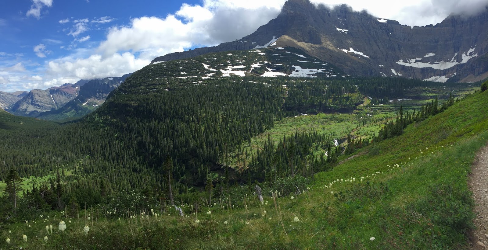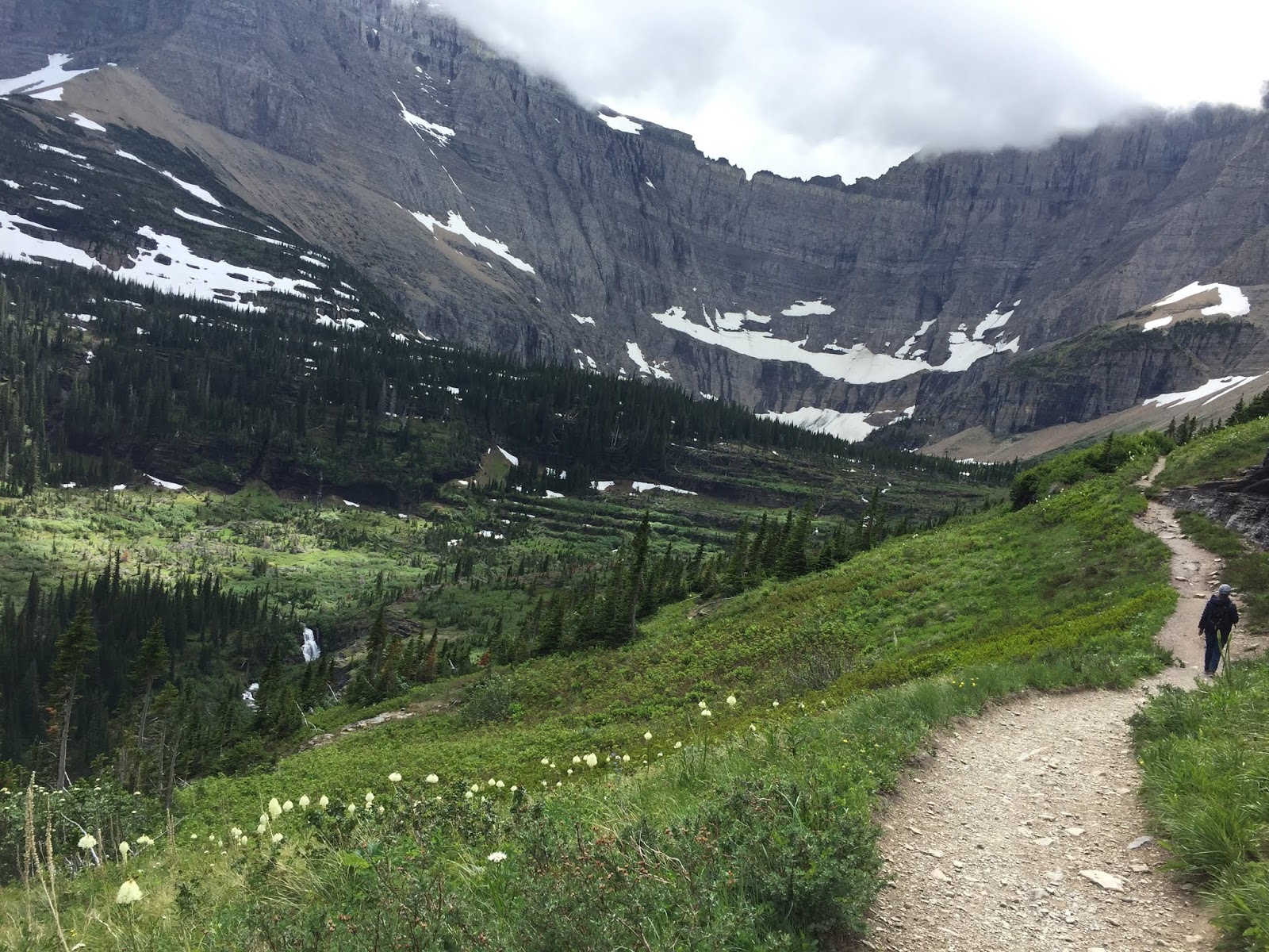 走過一段開闊的山區,雄偉的山壁如一座高牆環抱著迤邐的山道。沿路野花盛開,最吸睛的是熊草 (beargrass),第一次見到這種花很興奮,遠看像是山神的珍珠,遺落在山坡上潔白閃亮。