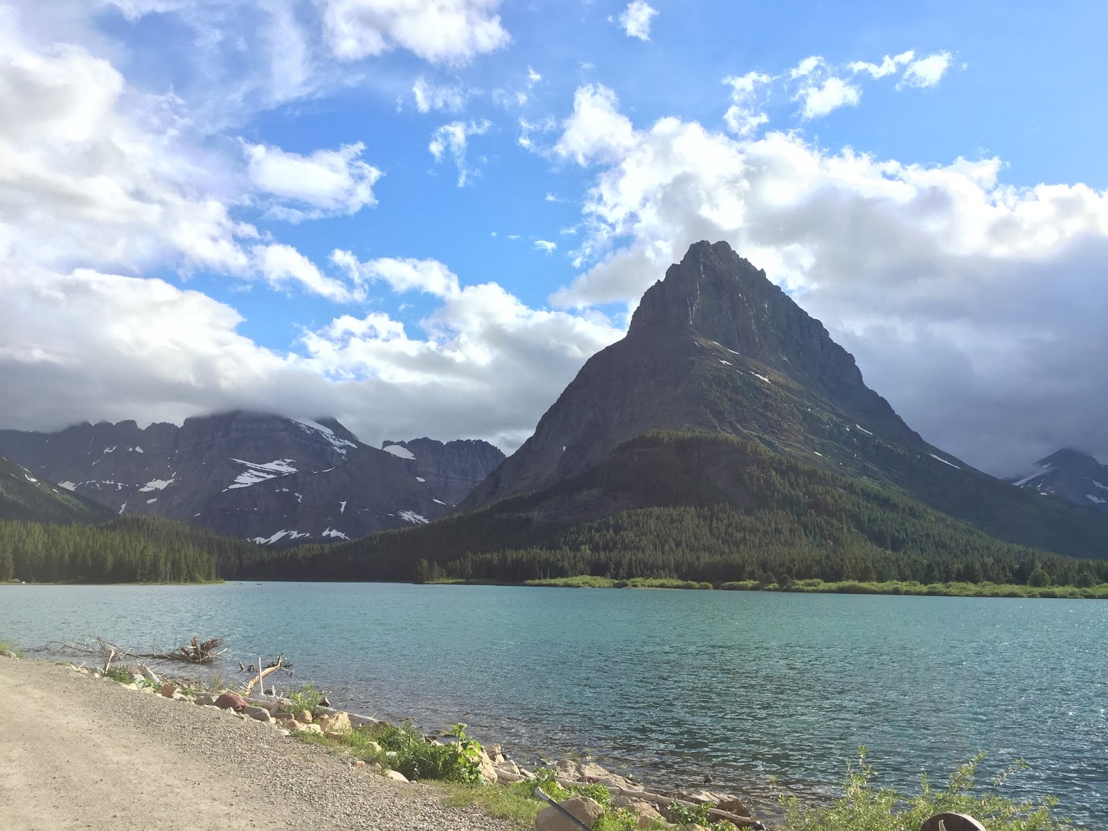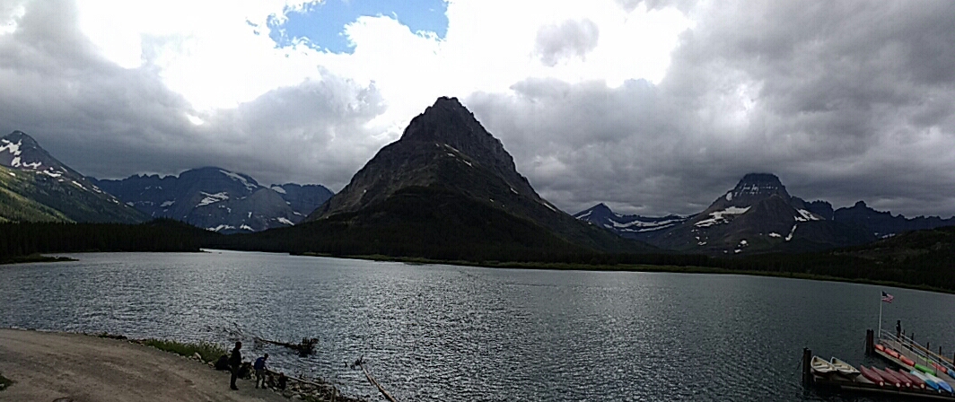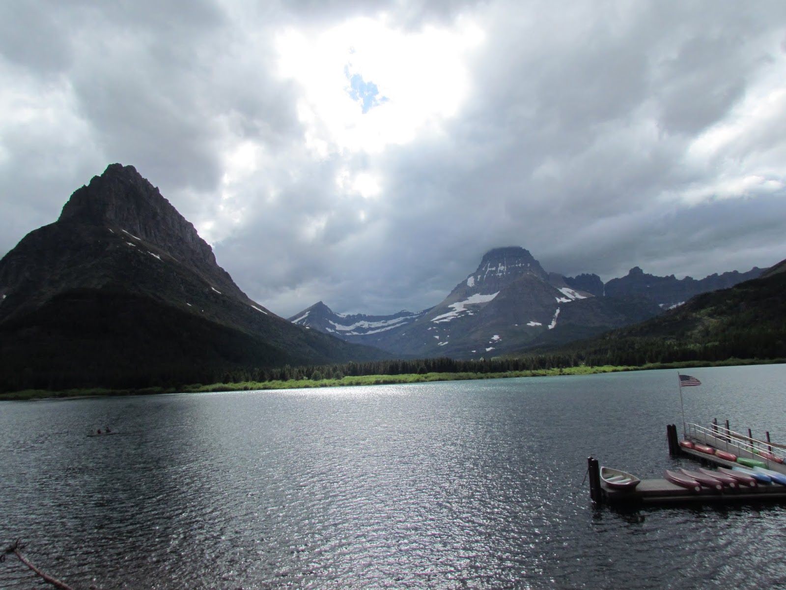 飯店湖畔是眺望Swifcurrent Lake的最佳觀景點。有人推薦觀賞晨曦中的湖水和山巒映影,我們卻在傍晚時分到來。群山在湖的西岸,雖然是陰天,雲裡的陽光仍讓山巒的身影逆著光,湖面微風輕拂粼粼波光中有人泛舟 ,雖沒有湖面如鏡的倒影,跳躍的水光一樣很迷人。