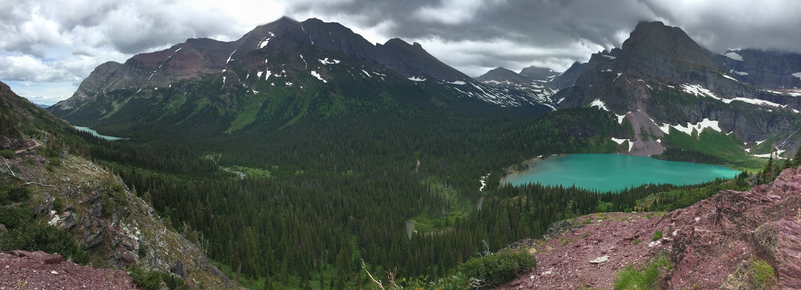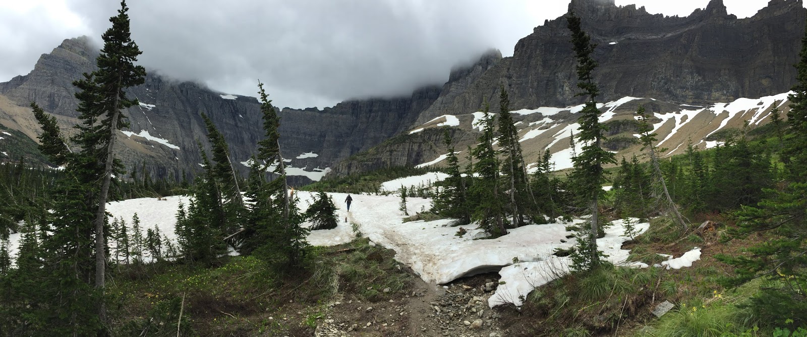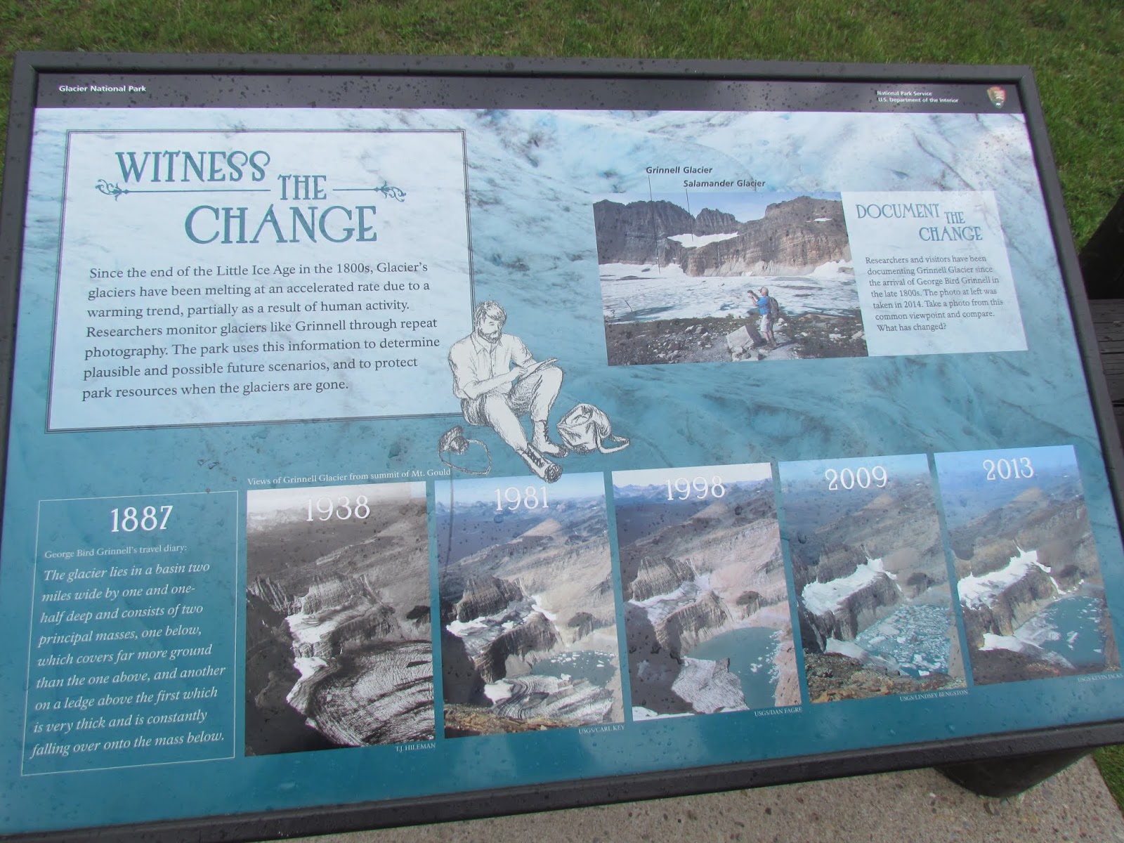 步道沿途經過Swifcurrent Lake,Lake Josephine,Grinnell Lake,最後抵達Upper Grinnell Lake ,欣賞位於Mount Gould北側的Grinnell Glacier融化形成的冰川湖,湖面有許多冰山浮在水上。Upper Grinnell Lake海拔2100公尺 ,形成於1930年代,當Grinnell Glacier開始融化,冰山從冰川碎裂。上圖翻拍自步道入口解說牌,不同年代的冰川湖照片見證Grinnell Glacier正在快速消融。這一條步道是公園最著名的步道之一,路很長但是相當熱門。