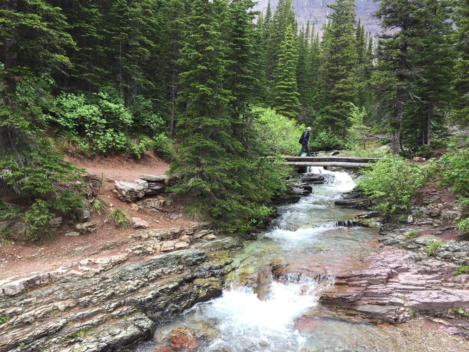雖然前一天沒有買到船票還是決定登山。由於擔心步道入口處的停車場停不到車,我們八點多就出發到步道入口。進入前看到公園招牌警示格林內湖步道Grinnell Lake Trail 由於水災關閉,看看地圖,與我們的目的地不是同一條步道。先是沿著Swiftcurrent Nature Trail走一段路,走入前天走錯的森林,走在幽暗陰森的森林裡心裡總是熊影幢幢,路上還是亂喊一通。