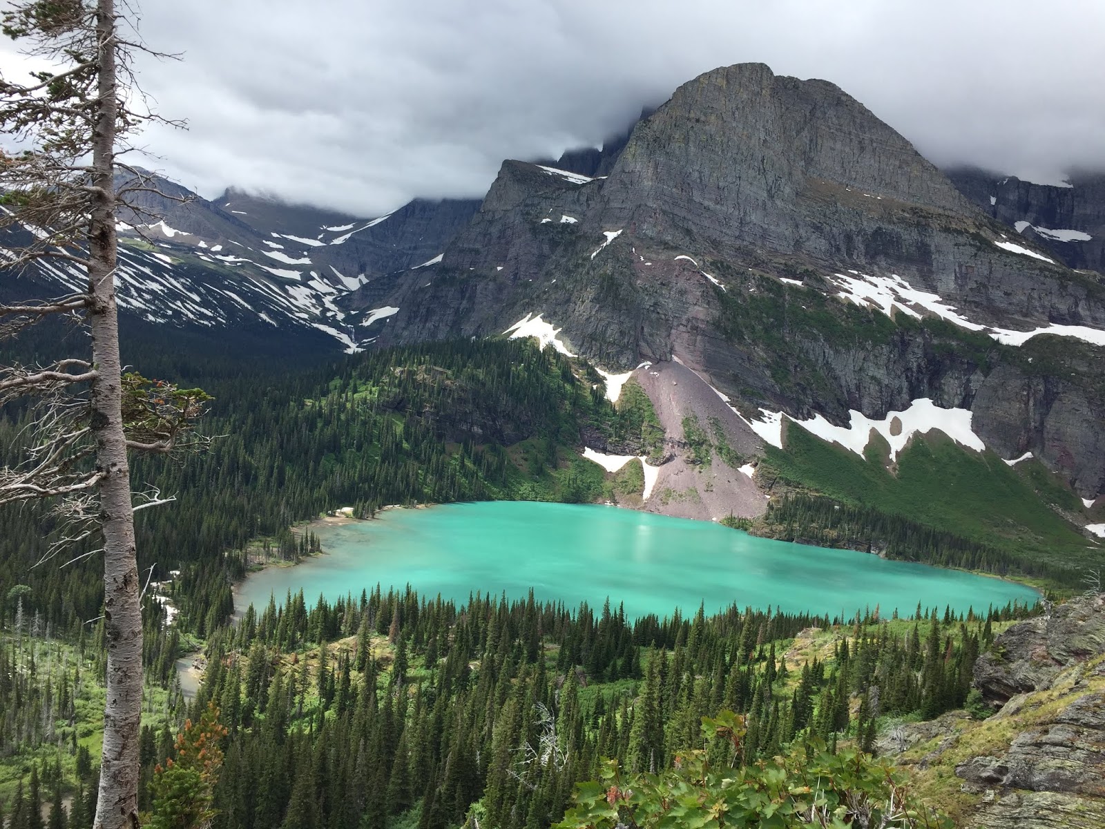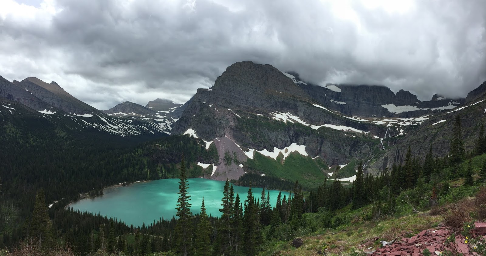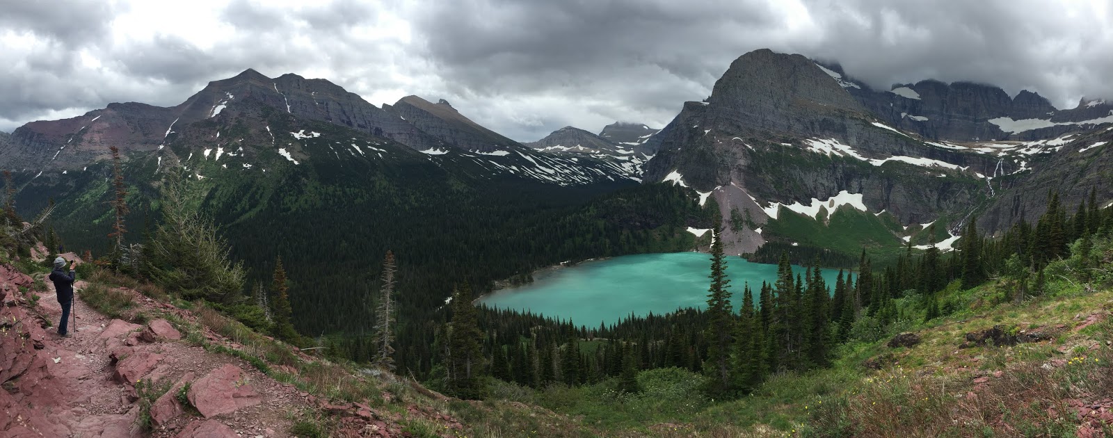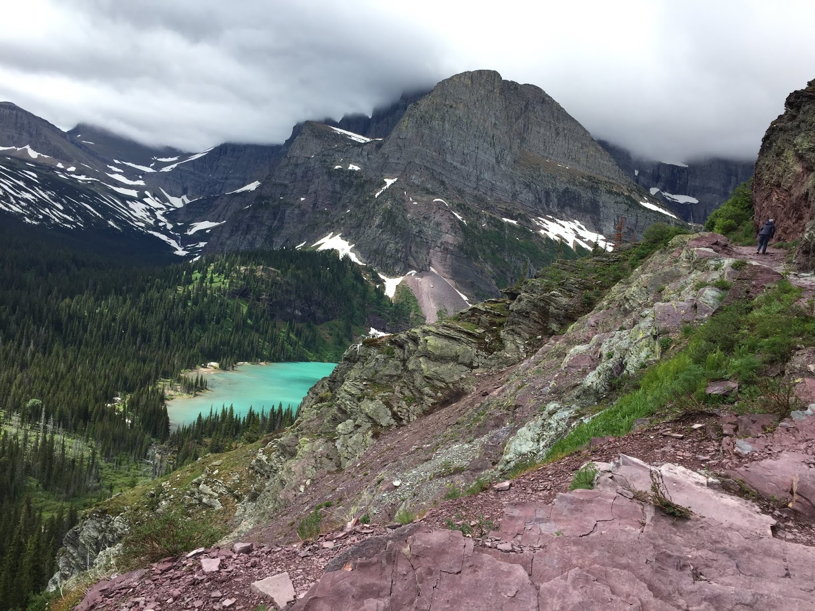 來到半山腰的步道,一邊岩壁一邊山崖,還好不是陡峭到會腿軟的程度,Grinnell Lake猶抱琵琶半遮面,已經可見半個身影了。