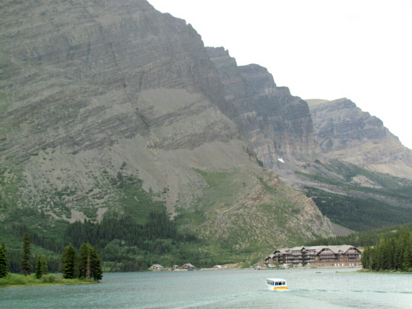 遇到熊之後繼續沿著湖邊步道走,遠遠就望見Many Glacier Hotel的身影了。公園最大的旅館Many Glacier Hotel 就在湖的東岸。