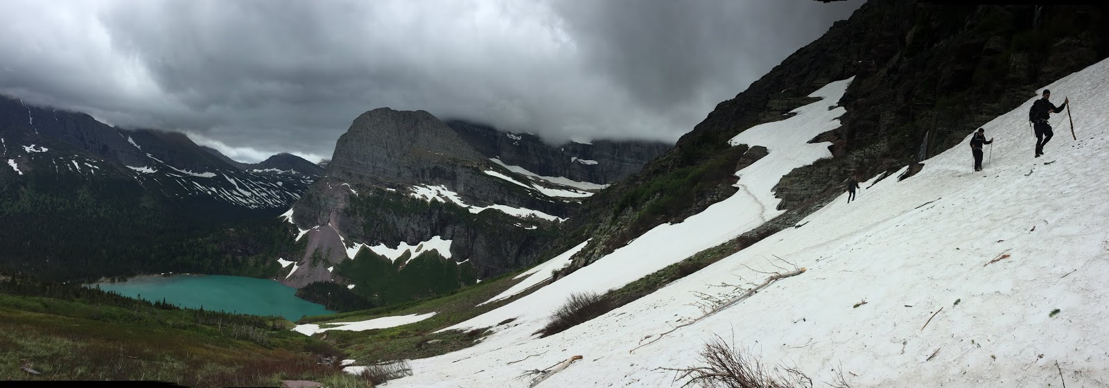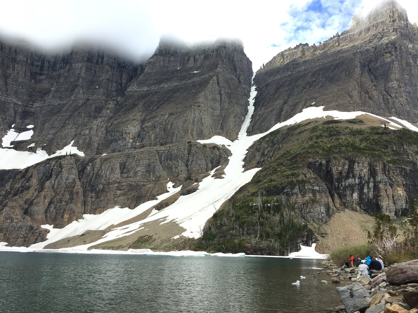 終於看見Grinnell Lake 了!還來不及高興就看到地上有危險警示牌大字寫著「前面雪地危險」“ SNOW HAZARD AHEAD”, 小字大意是下面步道陡峭,會經過很滑的冰原,也有危險的雪拱橋,強烈建議要有冰斧和個人止滑技術,穿防滑釘鞋會有幫助。可能需要厚重雪靴、地圖、指南針和找路技巧。