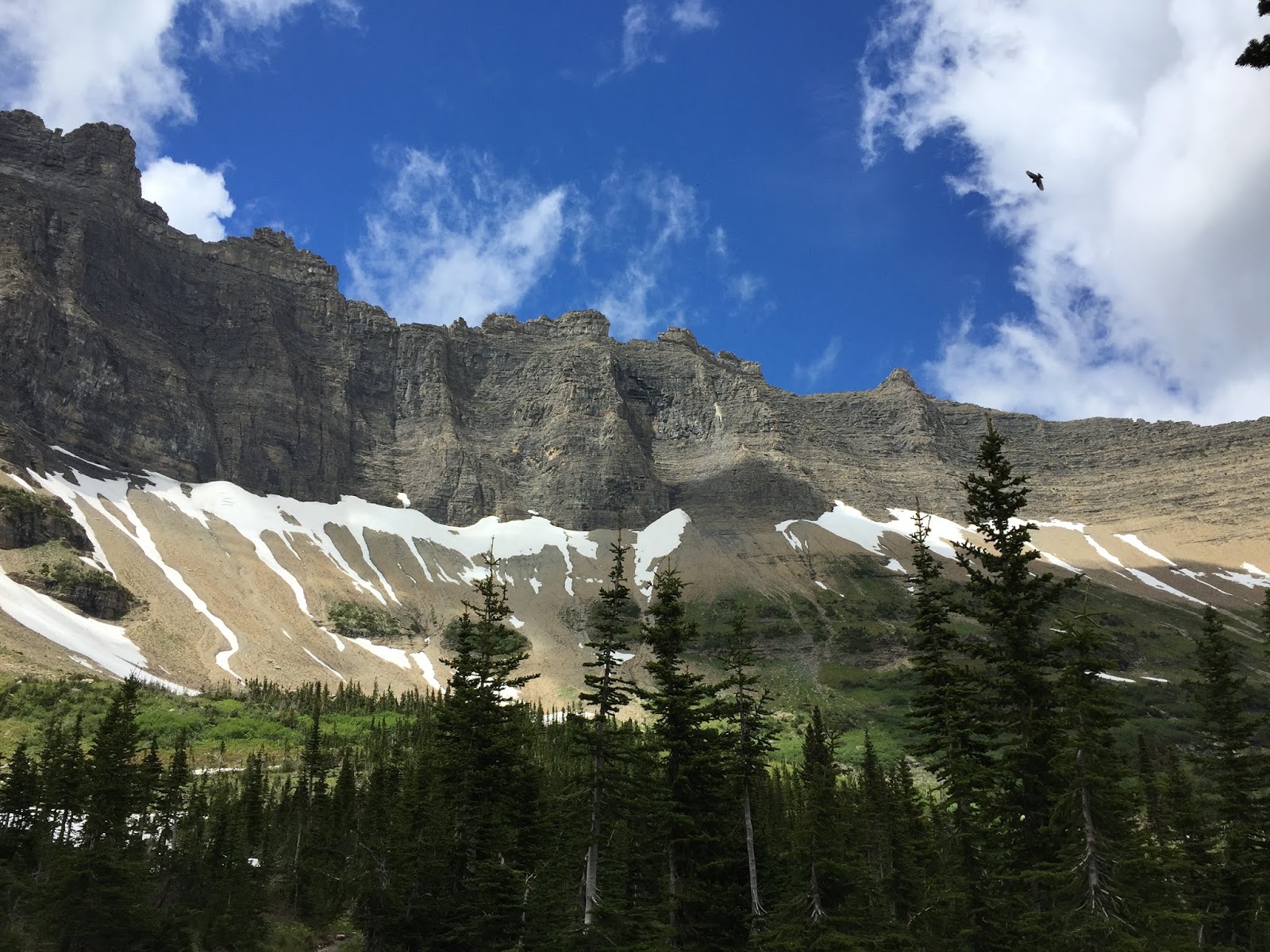 餐畢,沿著湖走一會兒後就踏上歸程,此時陰鬱的天空出現一塊藍天,陽光照在Ptarmigan Wall 巍巍陡峭的山壁上,一隻飛鳥劃過天際,是老鷹嗎?