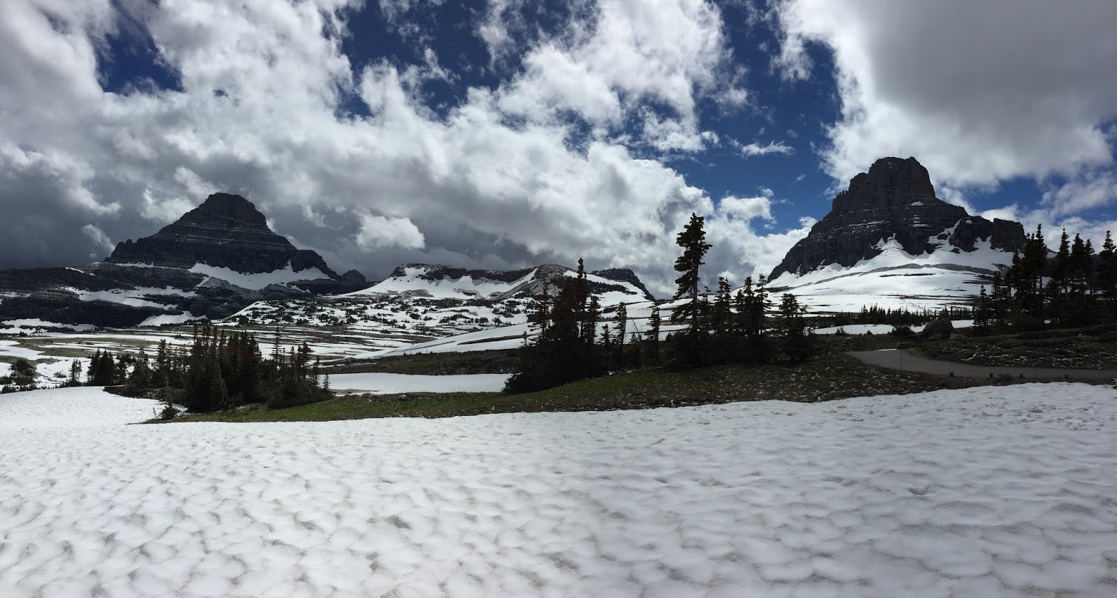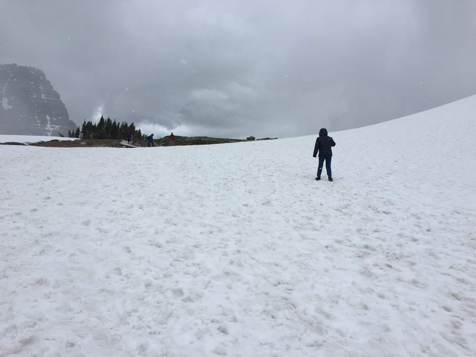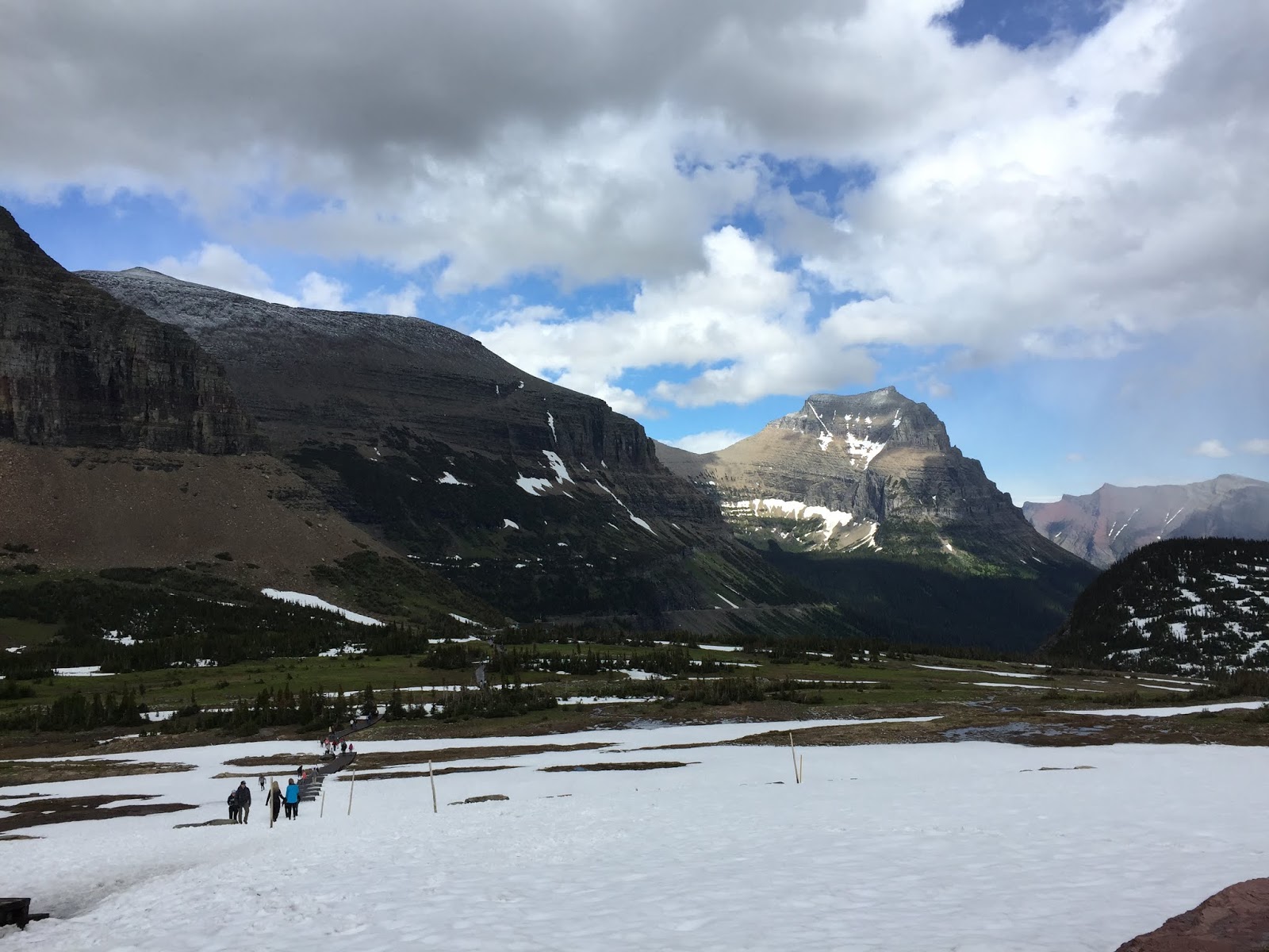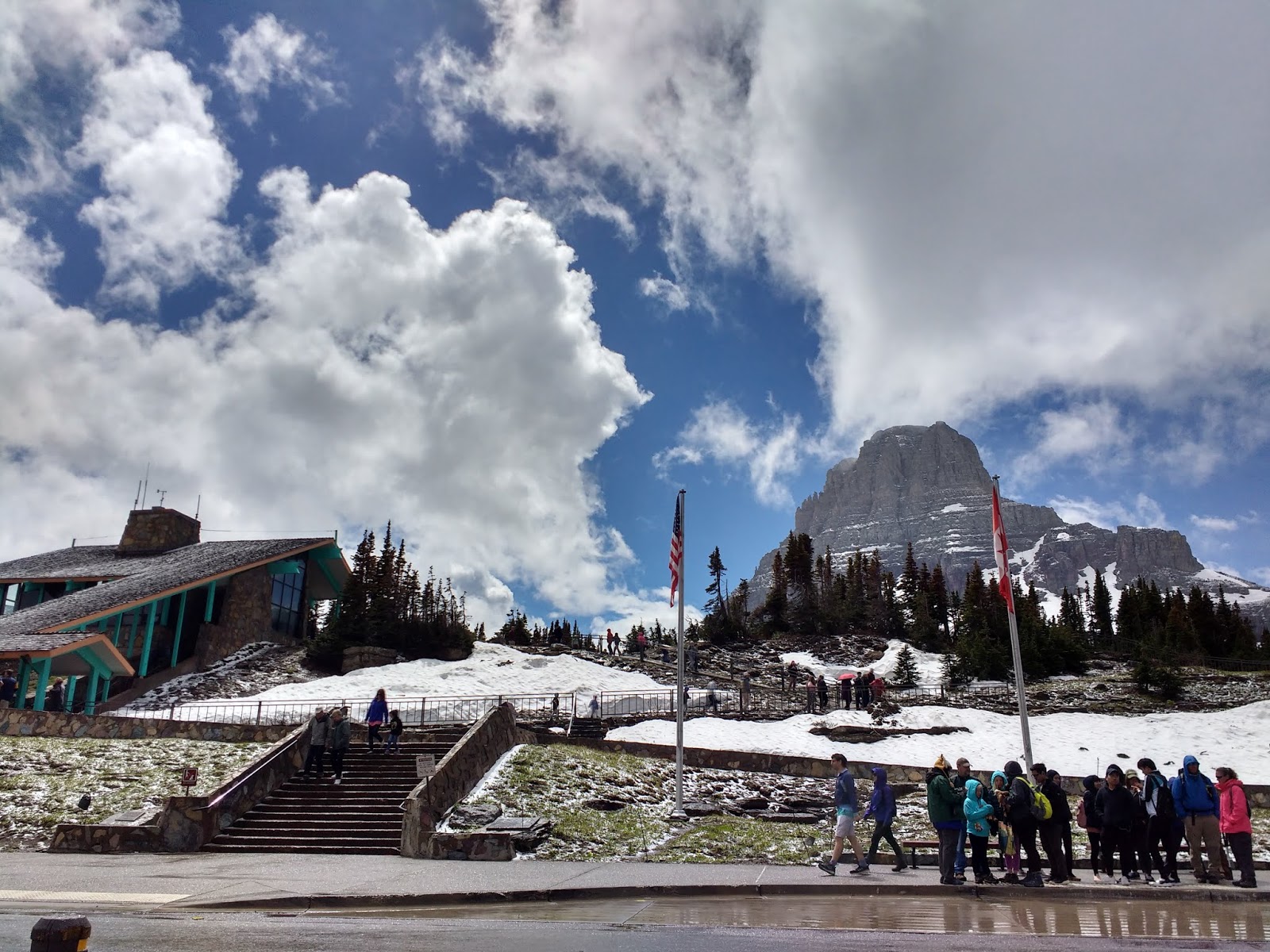 羅根山口Logan Pass 是向陽公路的最高點。抵達的時候正是烏雲滿天落雪紛紛,正發愁下大雪了怎麼玩呢?不到十分鐘雪就停了,陰霾的天空竟然露出一片藍天,正是「雪霽天晴朗」!