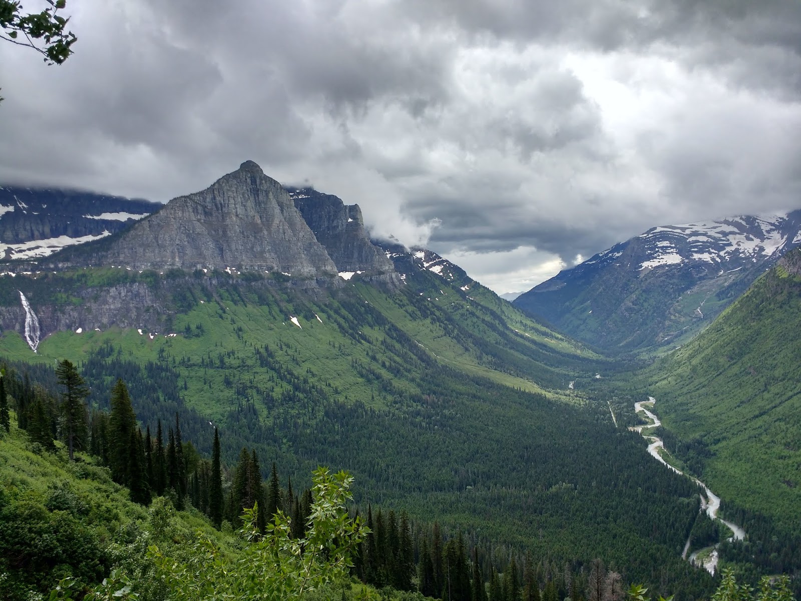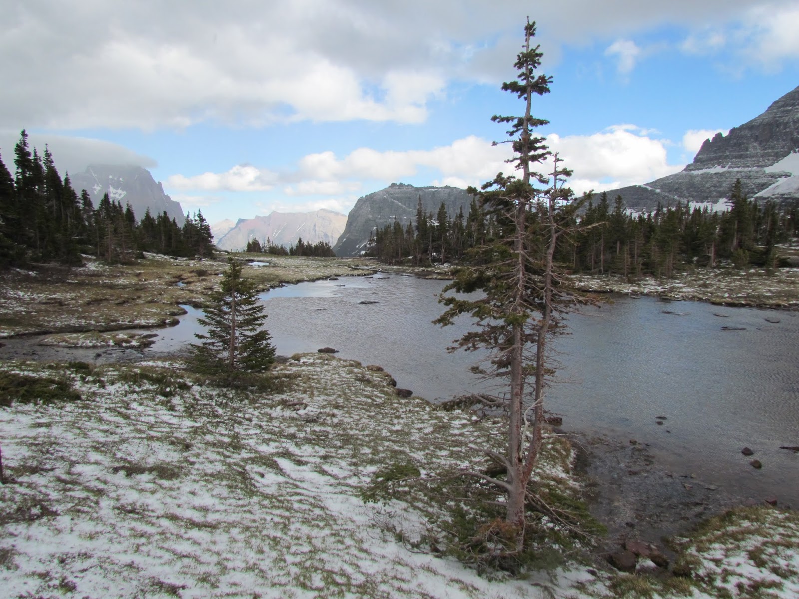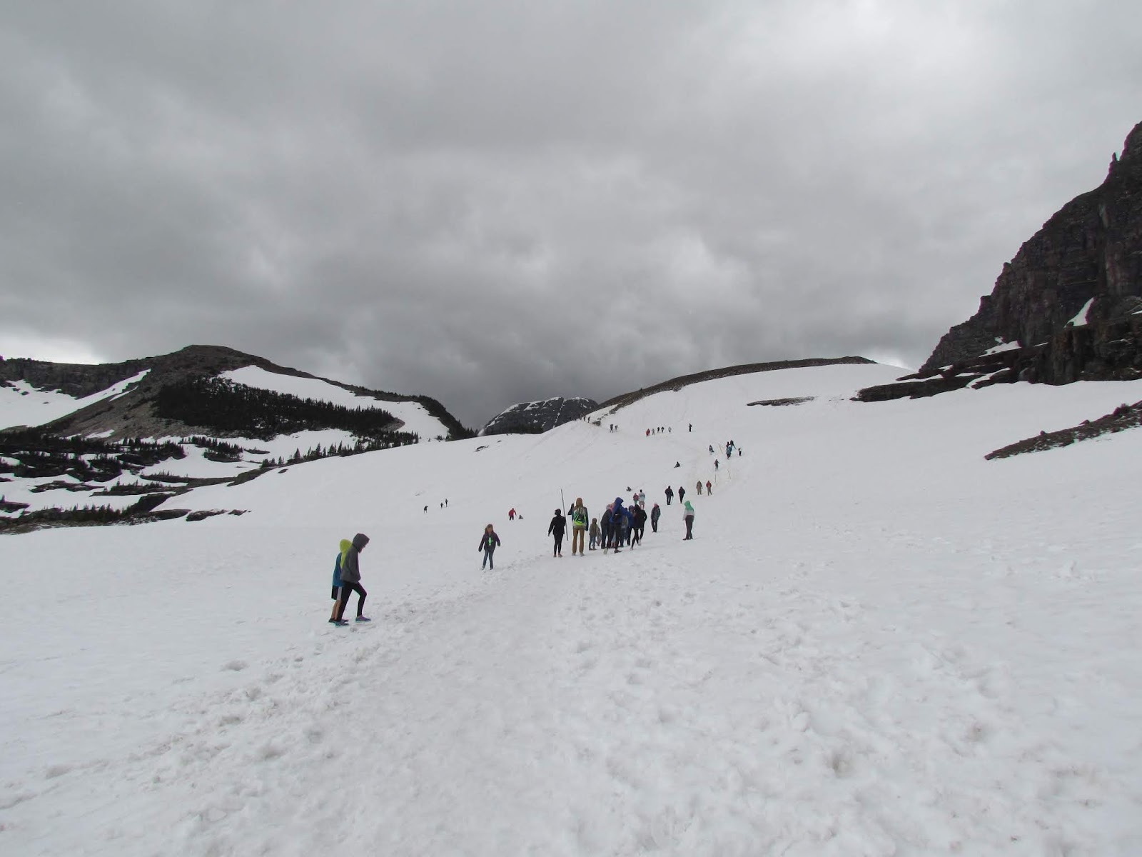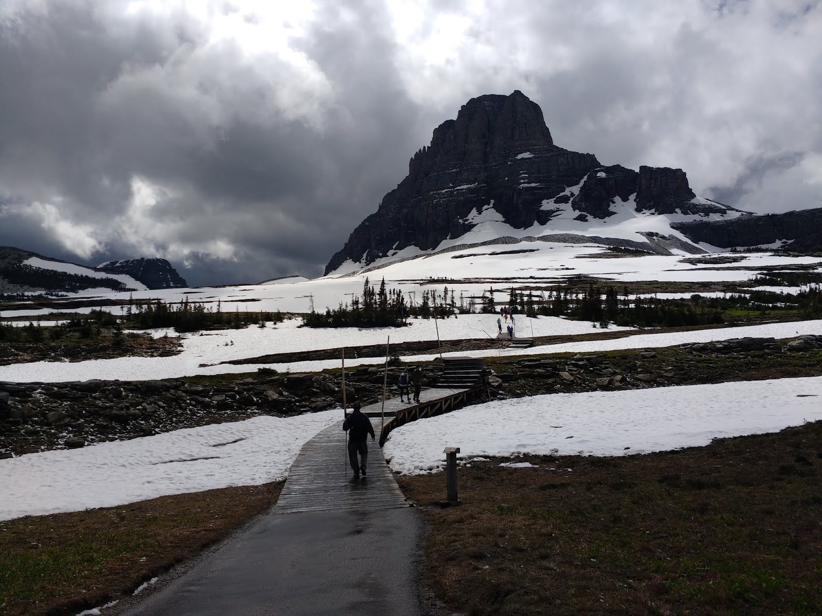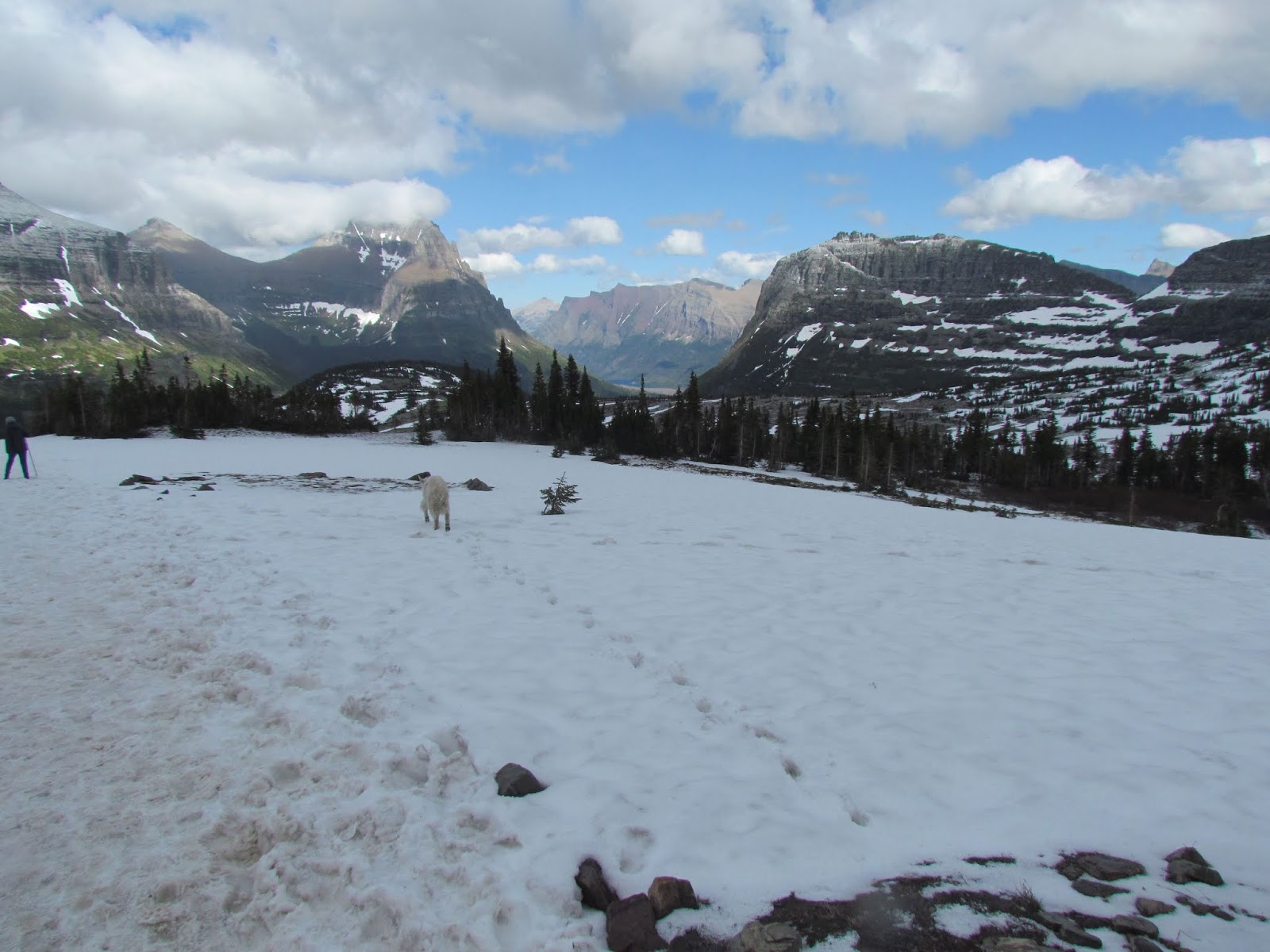 羅根山口Logan Pass 是向陽公路的最高點。抵達的時候正是烏雲滿天落雪紛紛,正發愁下大雪了怎麼玩呢?不到十分鐘雪就停了,陰霾的天空竟然露出一片藍天,正是「雪霽天晴朗」!