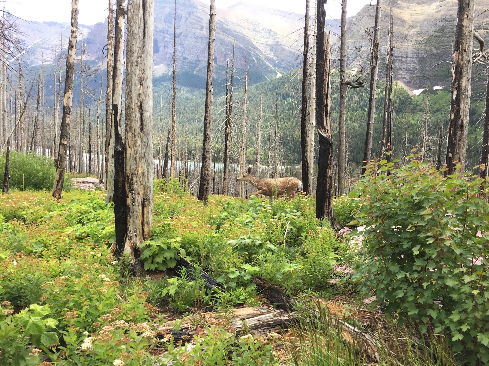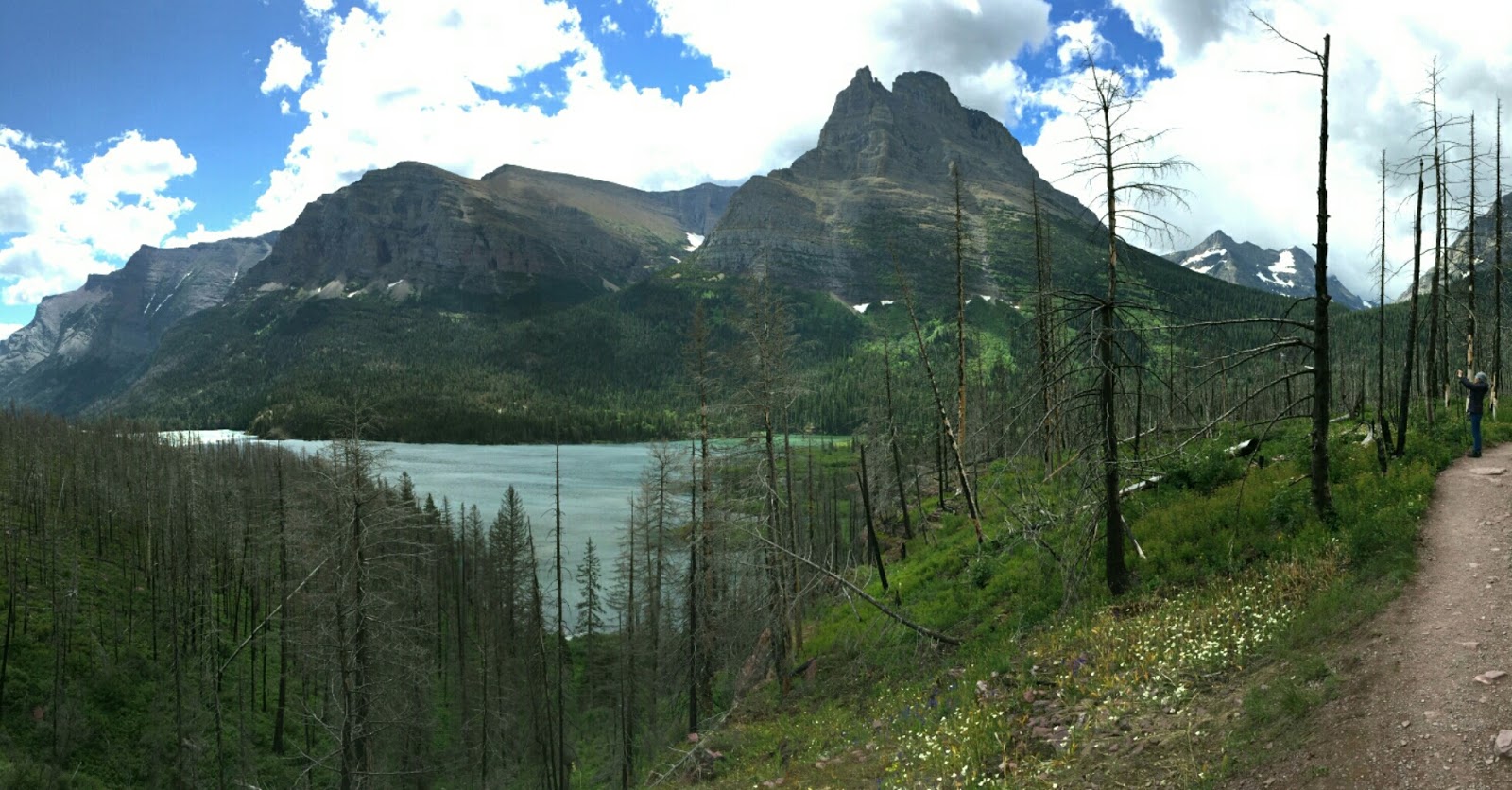 步道緩緩下降走入森林,這裡的林木應是被野火燒過,雖是森林但走起來頗為敞亮。走過St. Mary Lake的尾端,繞一段湖光山色的路。
