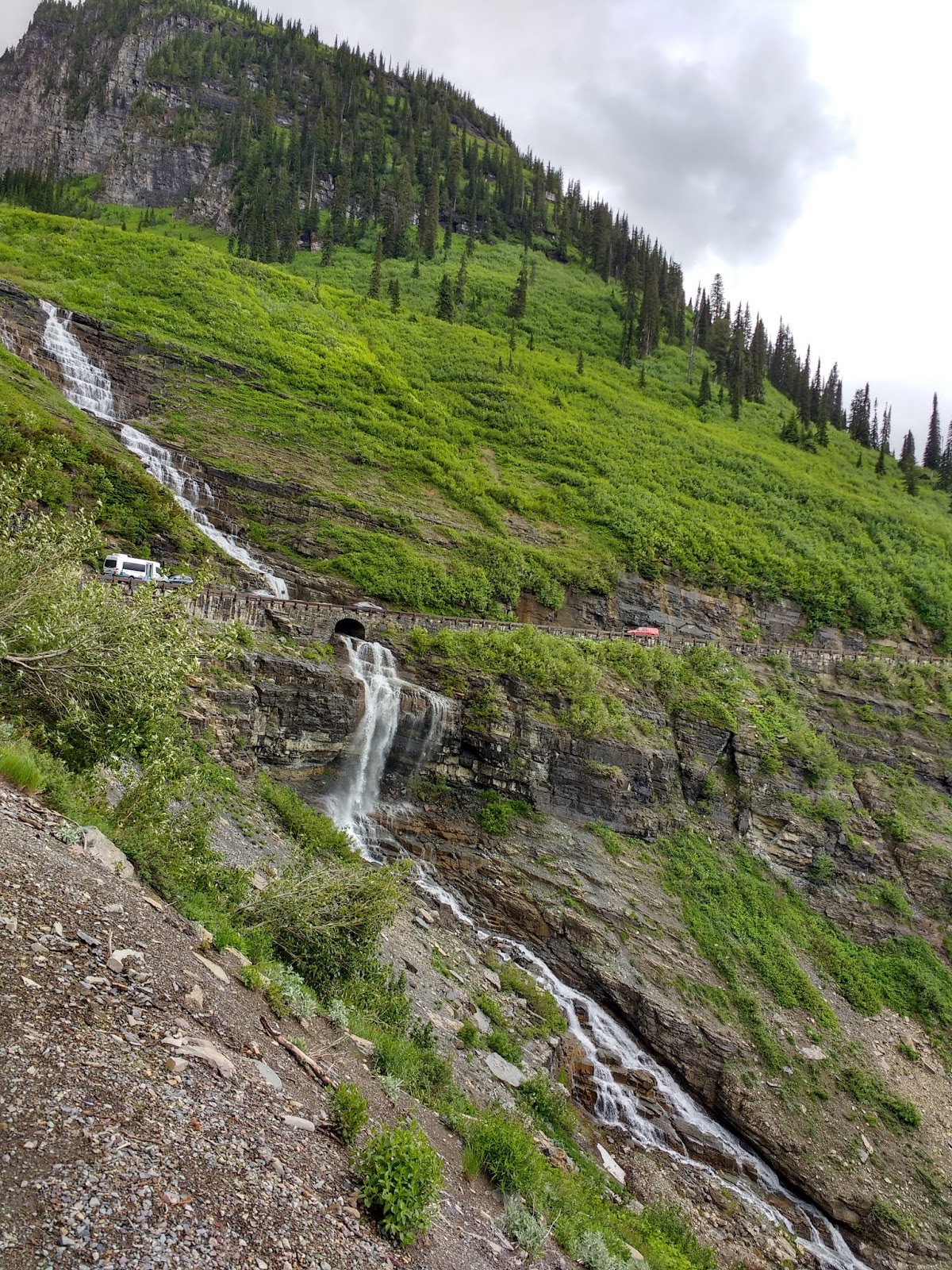 羅根山口Logan Pass到聖瑪麗湖St. Mary Lake之間,有三條瀑布連通步道,分別是Bearing Falls ,Sait Mary Falls和Virginia Falls。大多數賞瀑的人會將車子停在Sunriff Gorge Parking Area ,這個停車場很大,從這裡到Baring Falls 單程約半公里 ,有人會繼續沿湖繞到Sait Mary Falls。這日主要目的地是Sait Mary Falls和Virginia Falls,最近距離入口是巴士站St. Mary Falls Shuttle Stop,其次是步道入口St. Mary Falls Trailhead,兩入口相比較巴士入口來回省走 1.2 公里。由於賞瀑的人很多車子很難停,如果要賞瀑建議早一點去,或者將車停在Sunriff Gorge Parking Area再搭巴士過去。