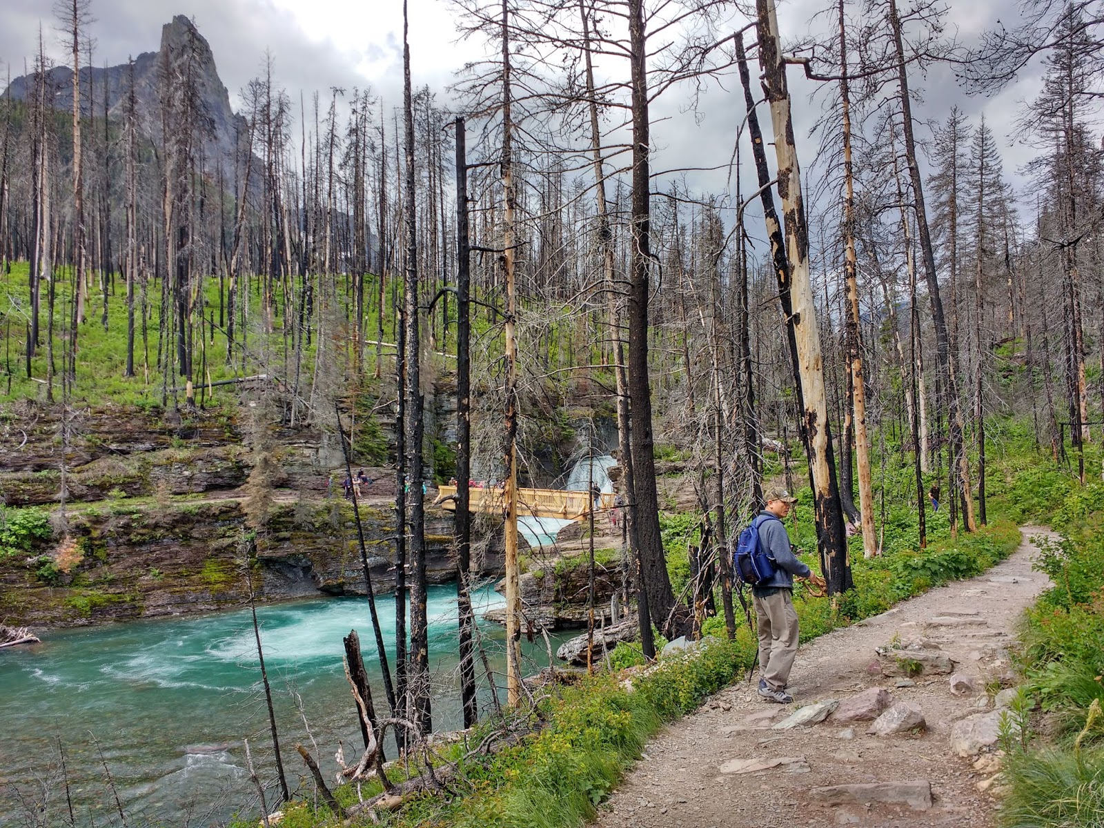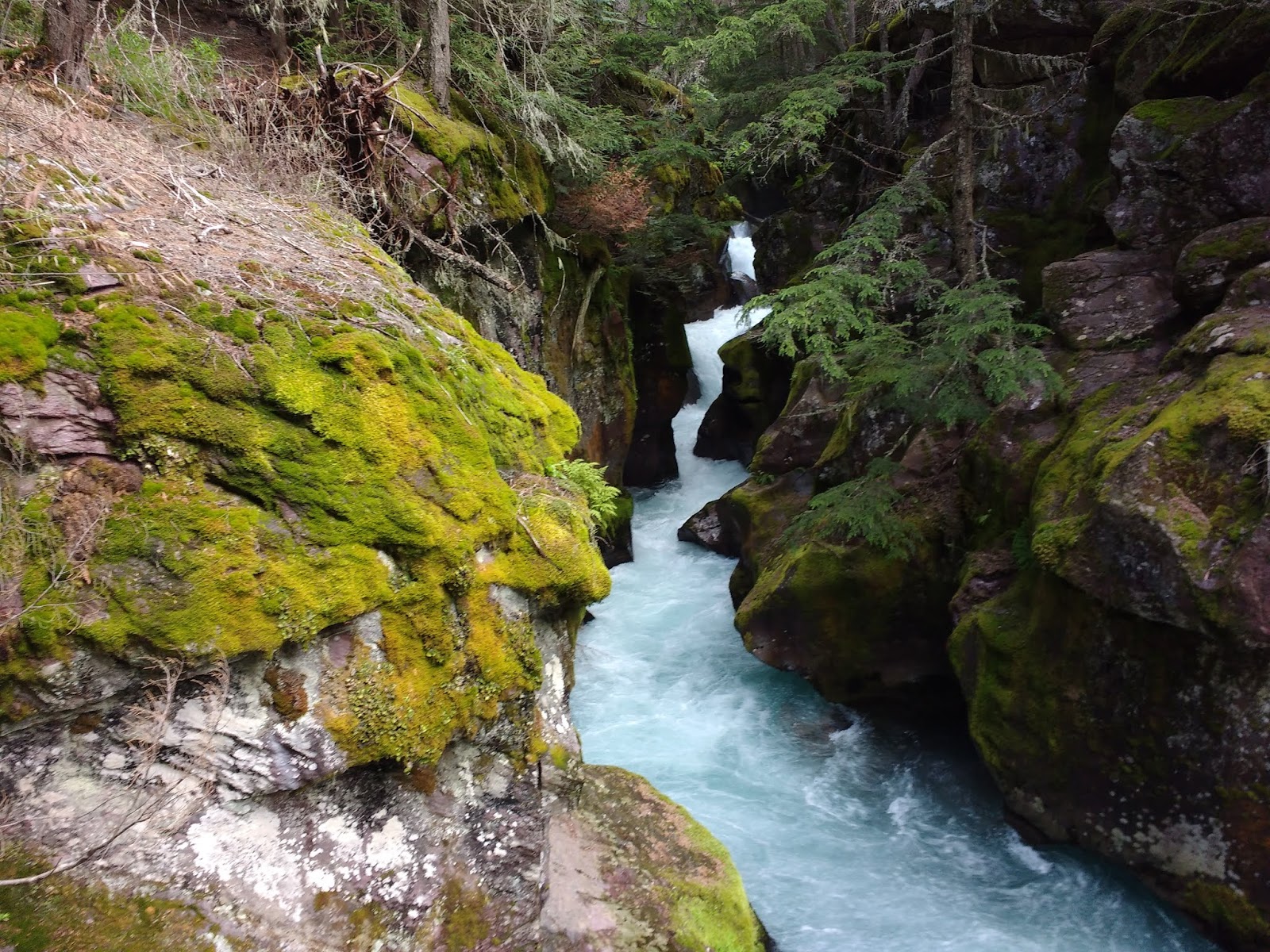 走到一半經過一座木橋,橋下雪崩溪Avalanche Creek流過,橋的上方是一條溪流流經岩石刻畫成渠的山澗流瀑,是雪崩峽谷Avalanche Gorge的下游,岩石上滿是青苔。0701