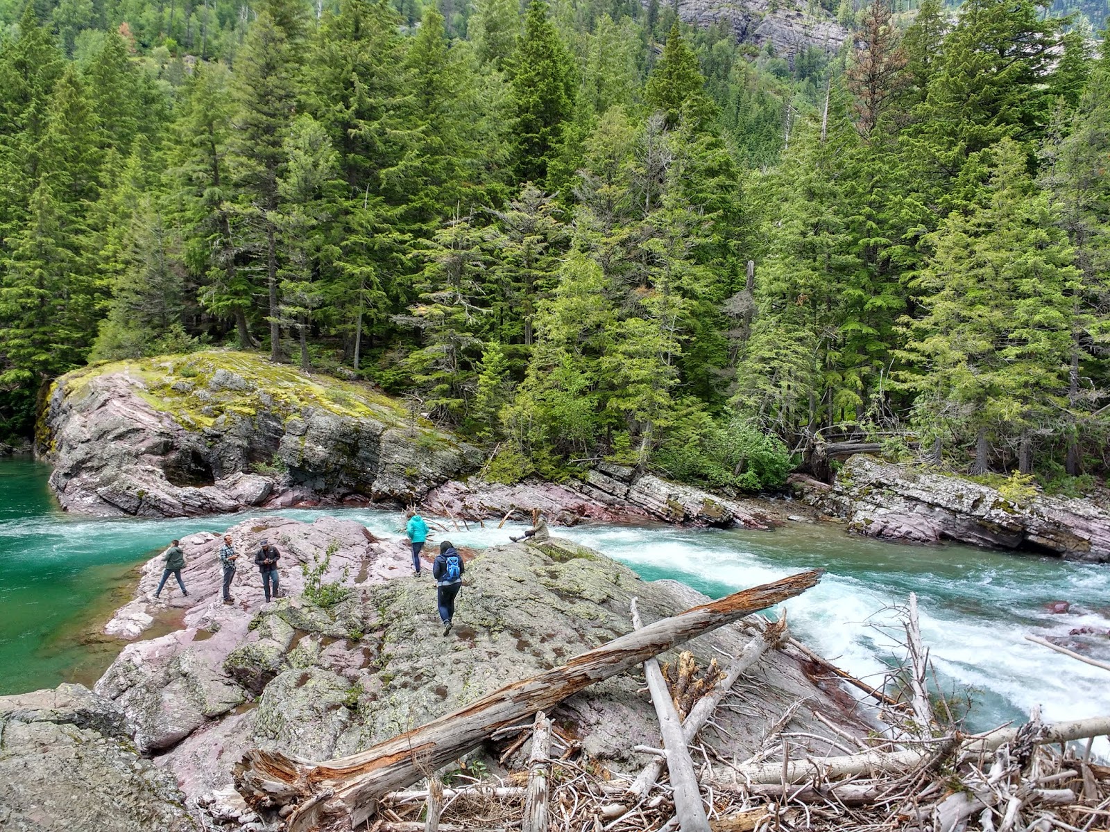 流到較下方的地方,溪水被大岩石阻攔,成為較緩慢的水流,被圍在裡面的溪水平靜地像一個小湖,這時水色有點變化成了藍綠色,這條溪的盡頭是McDonald Lake。