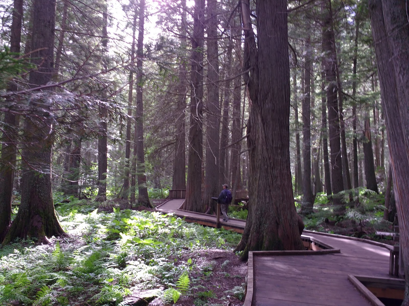 杉林棧道Trail of the Cedars,迴圈步道長約1.1 公里,沿途穿梭在杉林中,樹高超過24公尺,大都是西洋鐵杉和紅杉。雪崩湖步道Avalanche Lake Trail,來回7 公里 ,約3 小時,也是同一個入口,走進之後才岔開。天色已昏,我們只走杉林棧道。