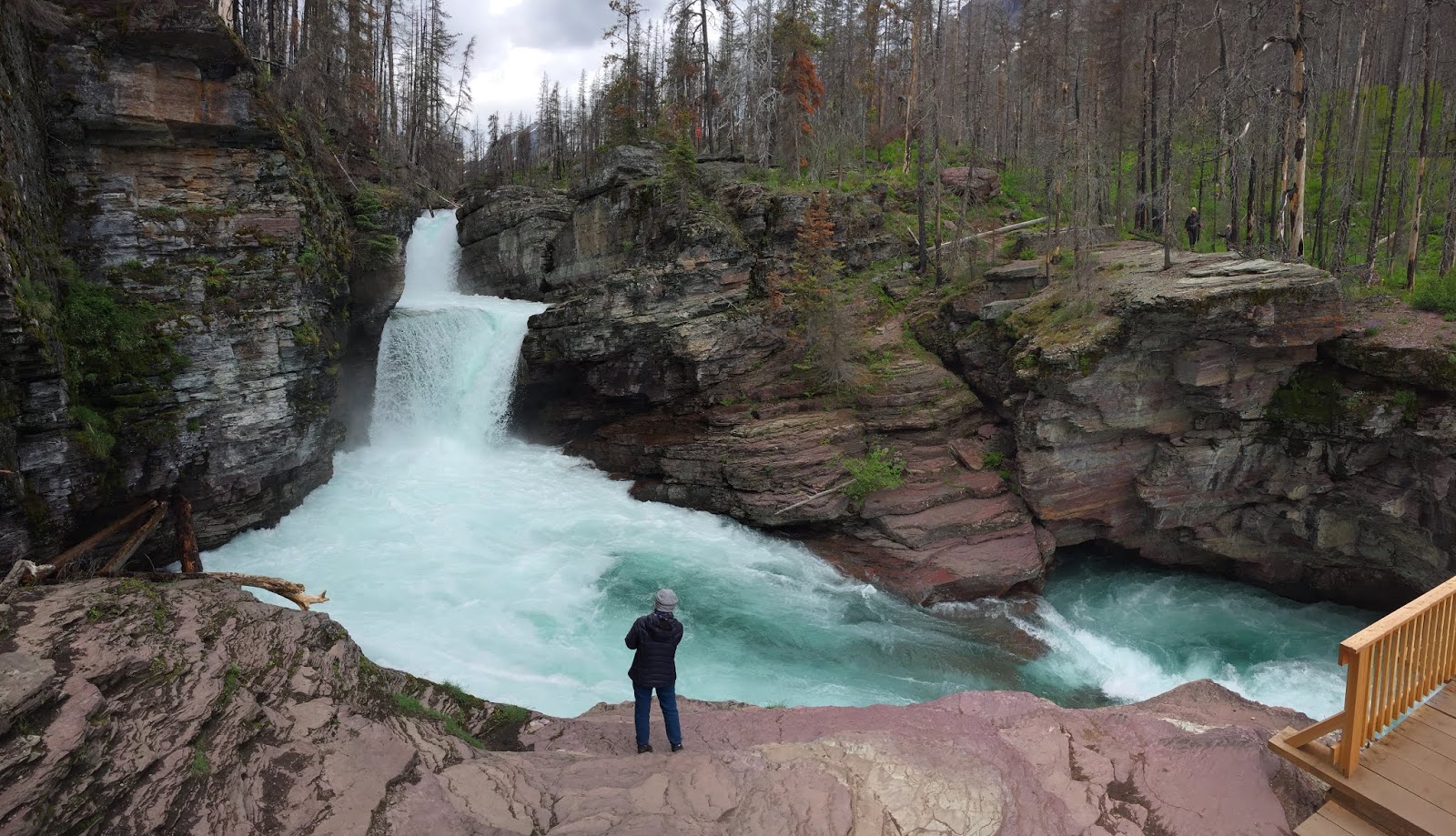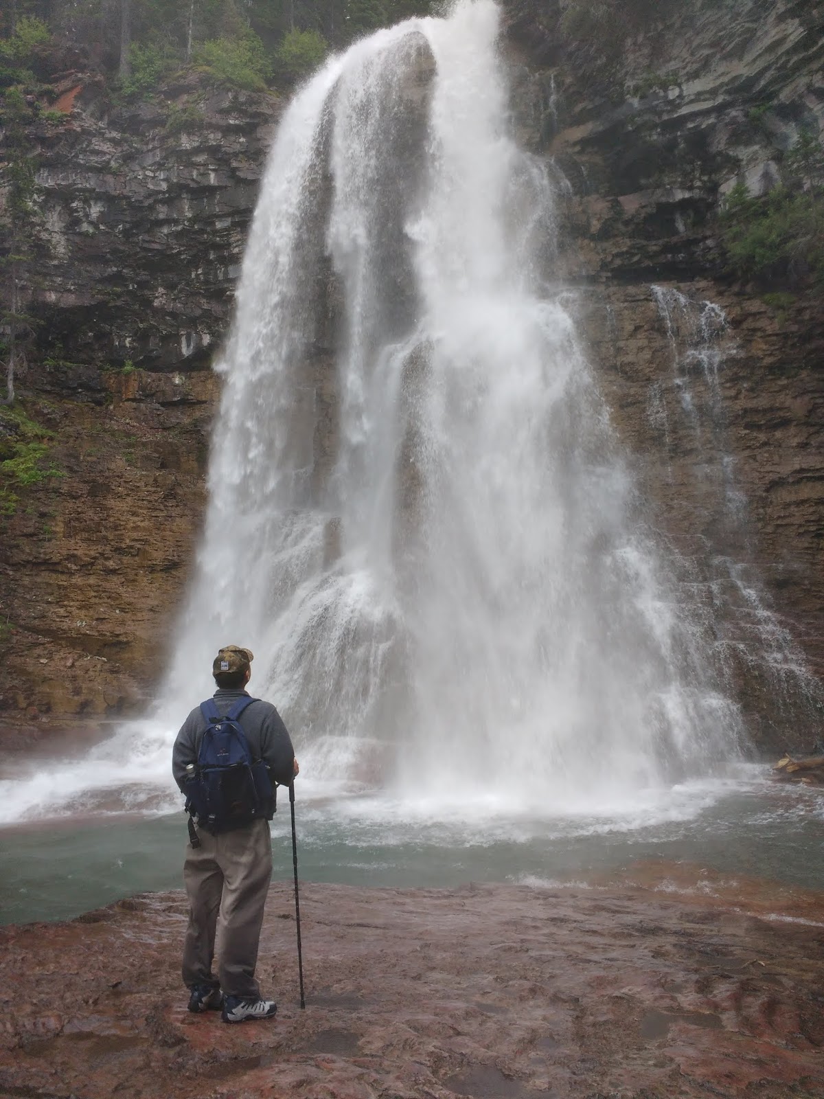 再往上走1公里到Virginia Falls,坡度上升87公尺,前段緩升,最後快到的時候陡升,不是很難爬。終於到了瀑布,這條瀑布傾瀉而下的地方正好是一個大平台,可以走到下方近處與瀑布合影,只是短短幾秒鐘的時間整條褲子全濕透了。
