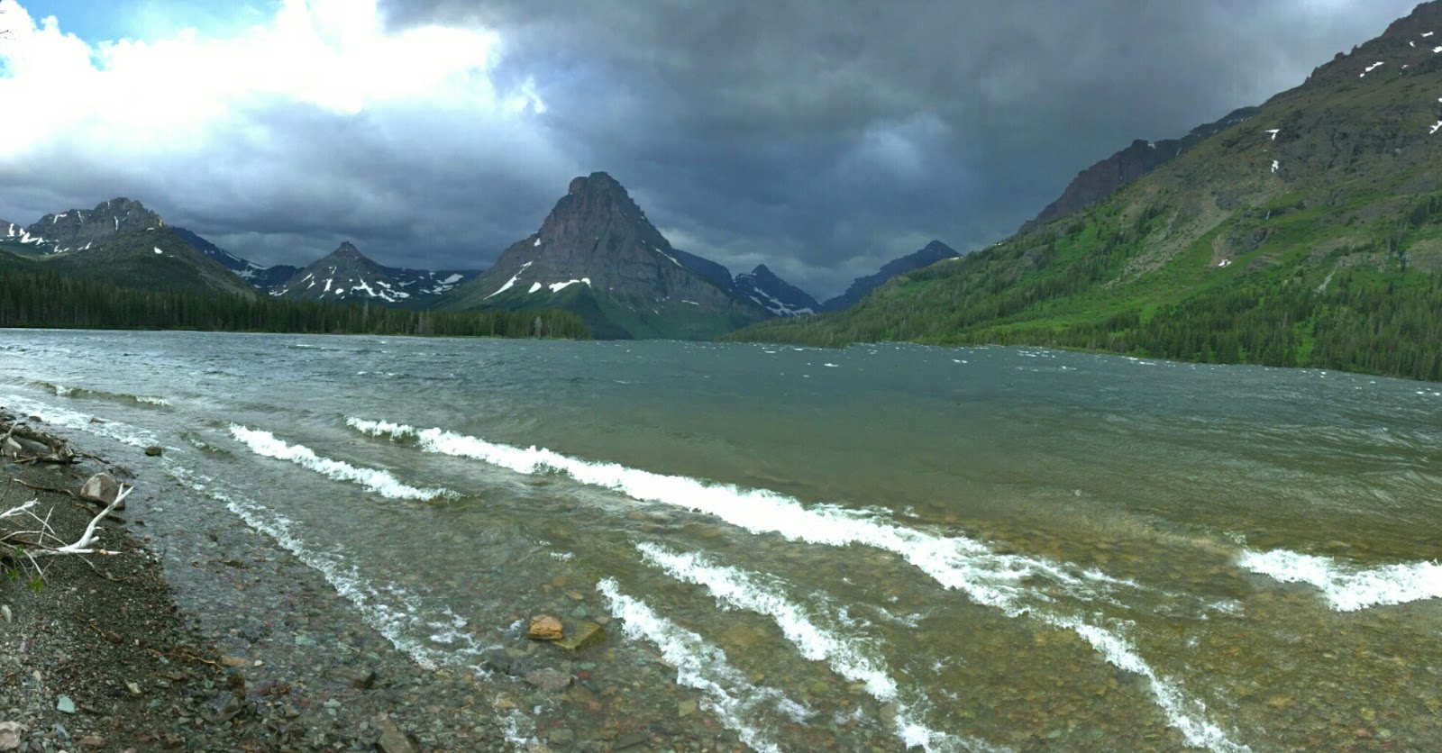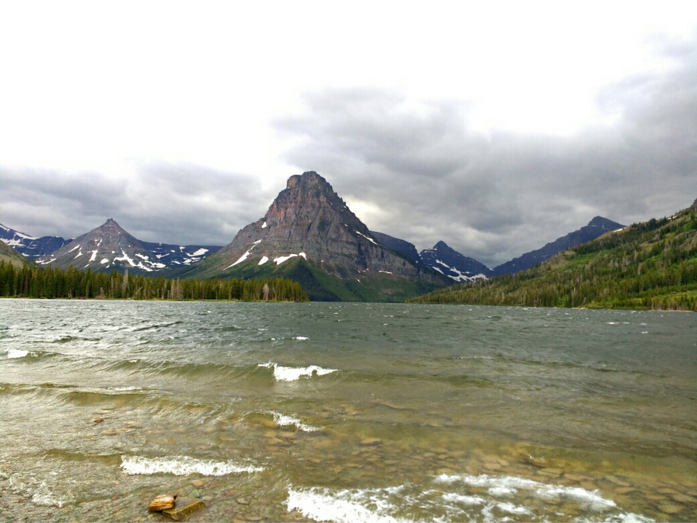 雙藥湖Two Medicine Lake,長3.2公里寬0.53公里。海拔2523公尺高的 Sinopah Mountain高聳於湖的西邊。