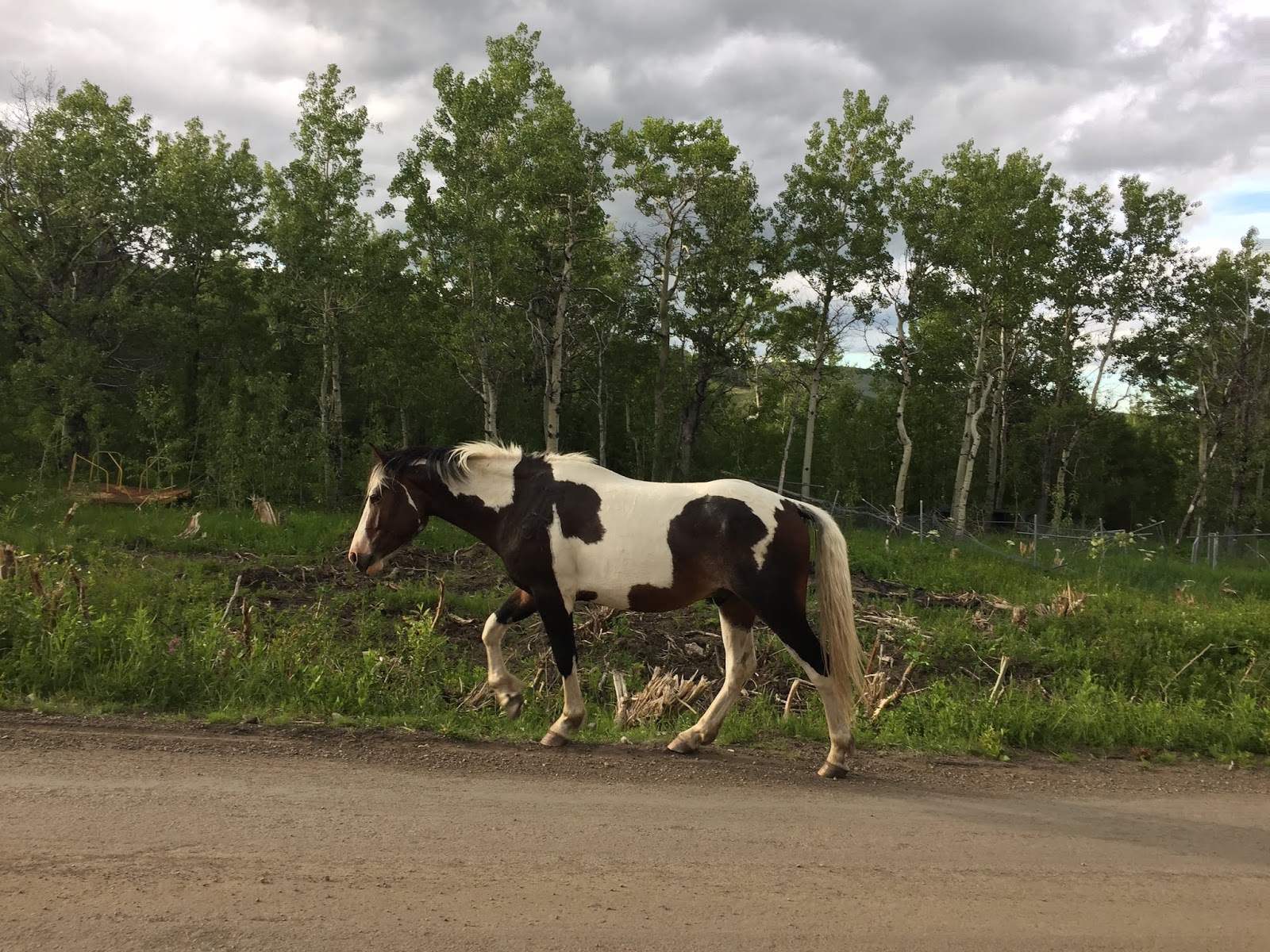 回程經過一個牧場正好遇到一群牧場馬過馬 路,看見一隻像穿著乳牛的黑白花紋外套的馬,趕緊按下快門照下牠的英姿。