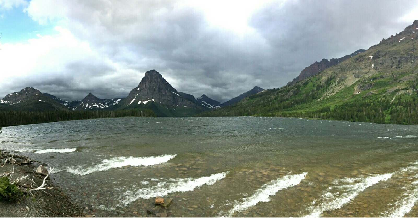 抵達的時候約下午五點多了,溫帶原本很晚才會天黑,但是這時竟然刮大風天空越來越灰黑,風很大站都站不穩,照幾張湖景後竟下起大雨,快速躲進Two Medicine Store。