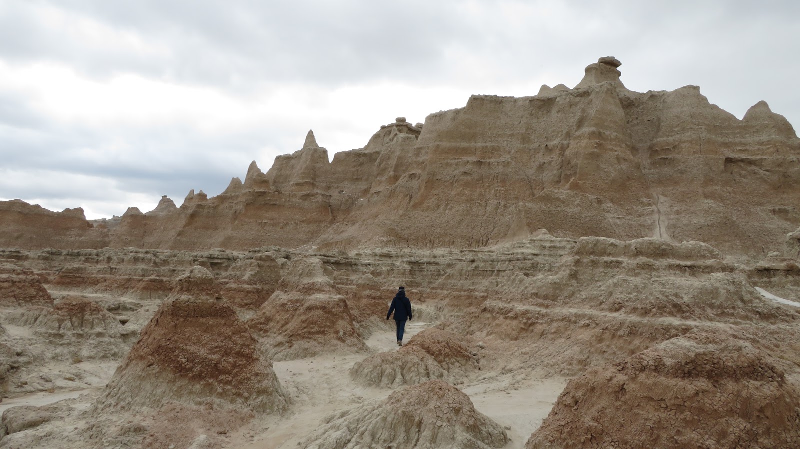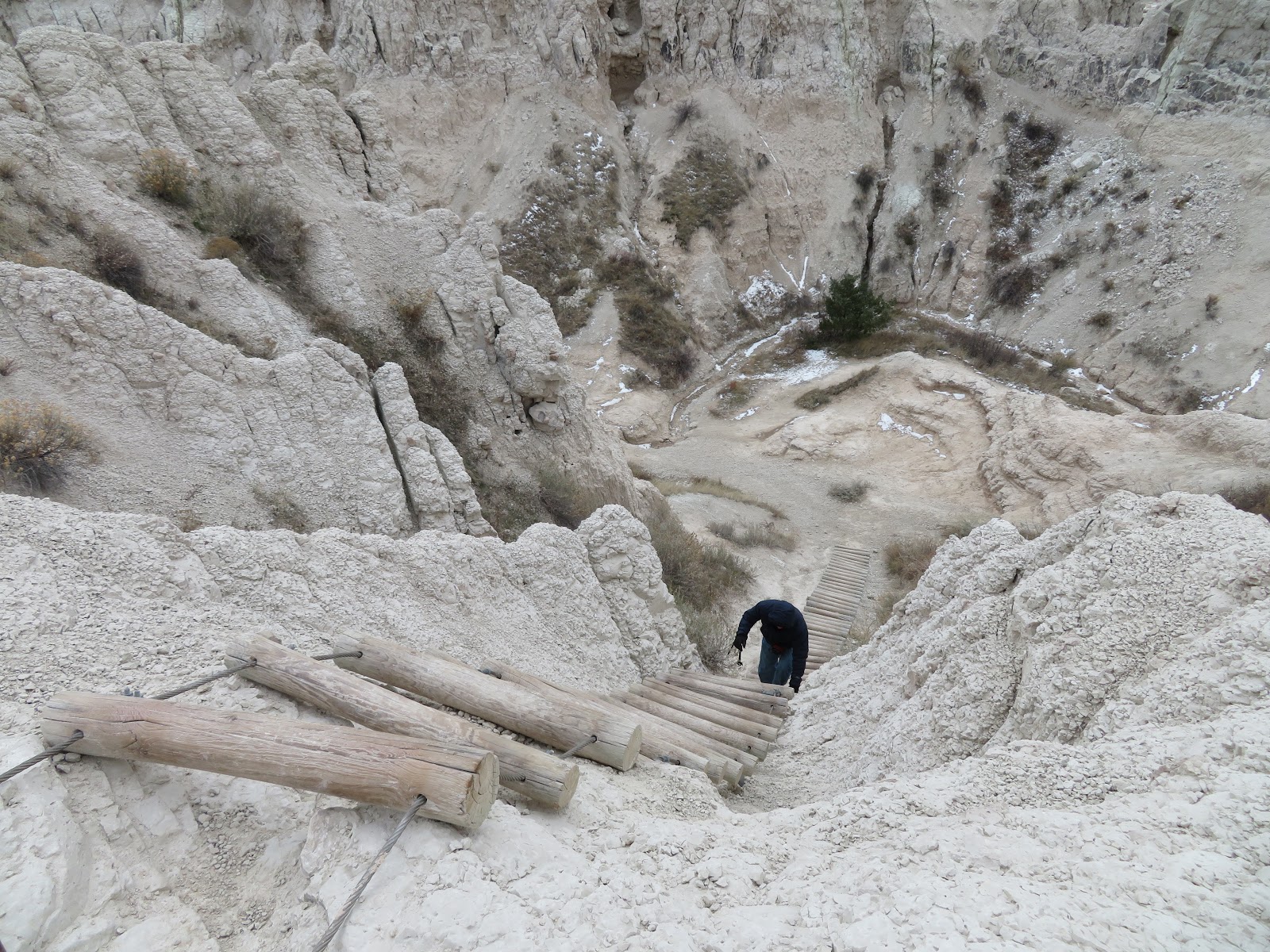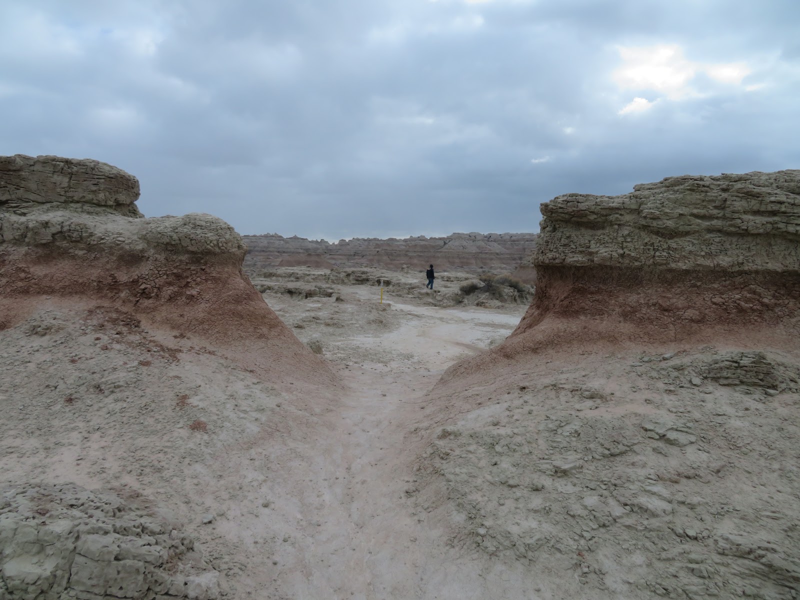 從這裡沿著黃色號碼桿可以走入惡地之中。水流侵蝕惡地,沉積的岩層露出來,直至今日岩層仍持續被侵蝕成峽谷和尖塔狀的峰頂景觀。