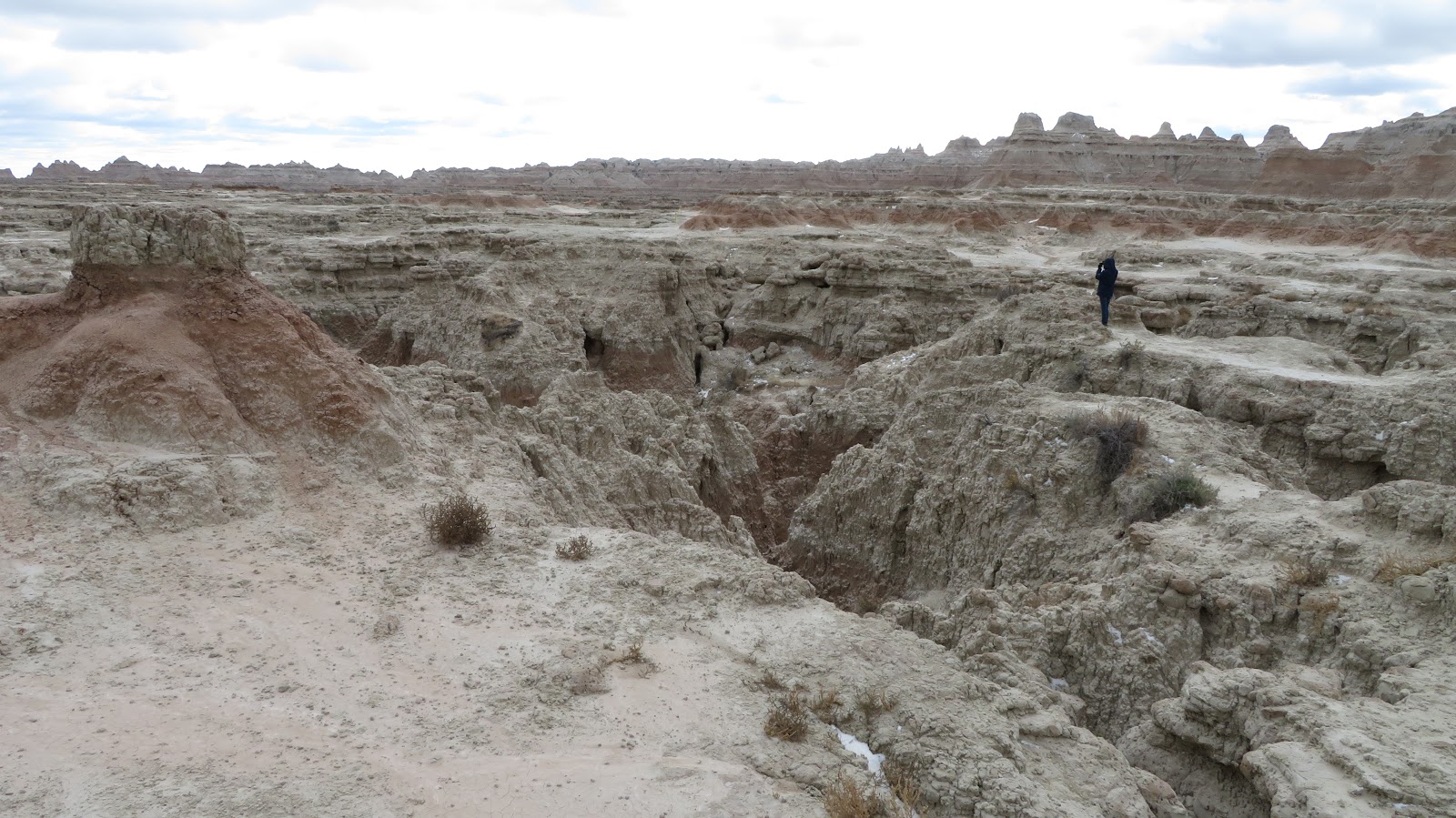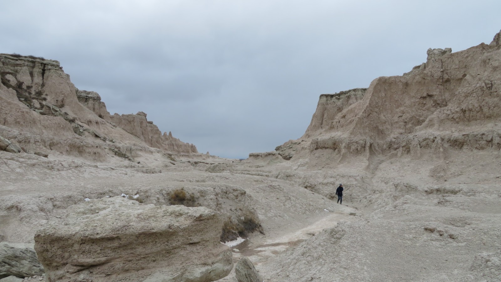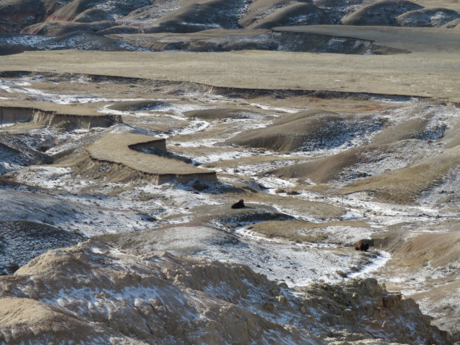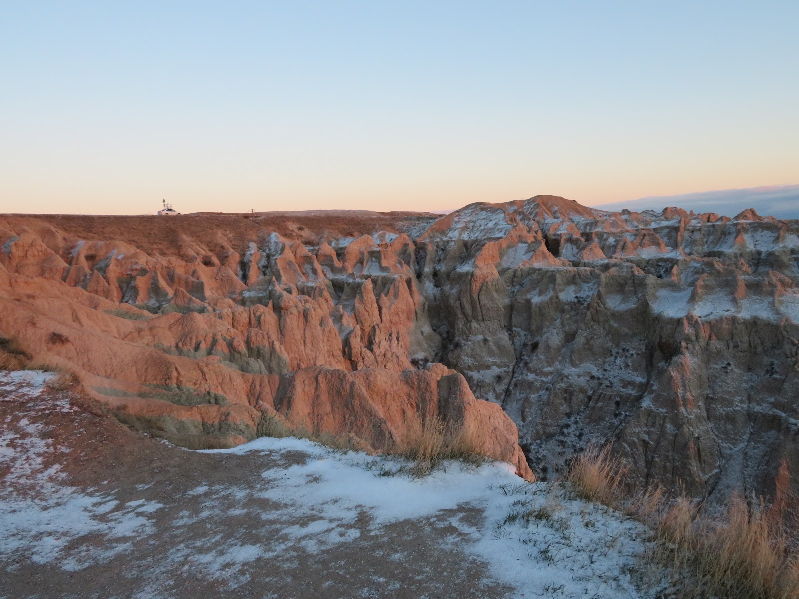 亮麗的陽光,遠眺的視野很好,微雪點綴的惡地岩層更加層次豐富,只是好冷。