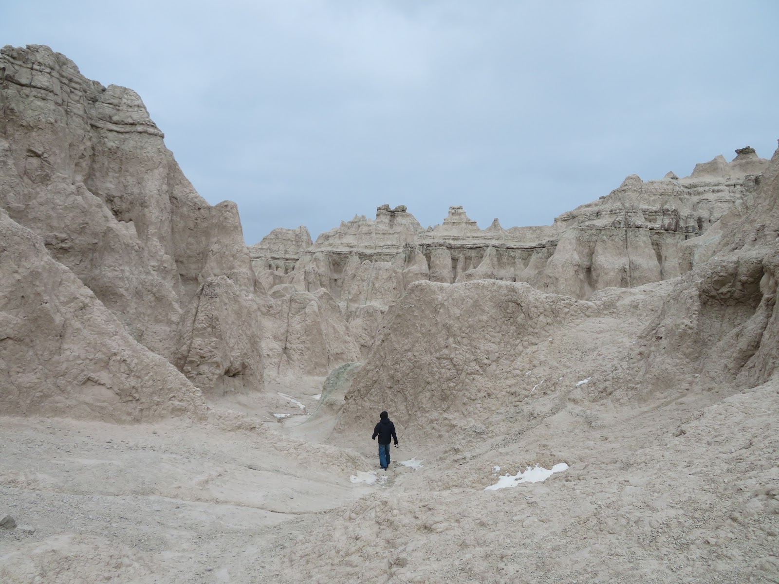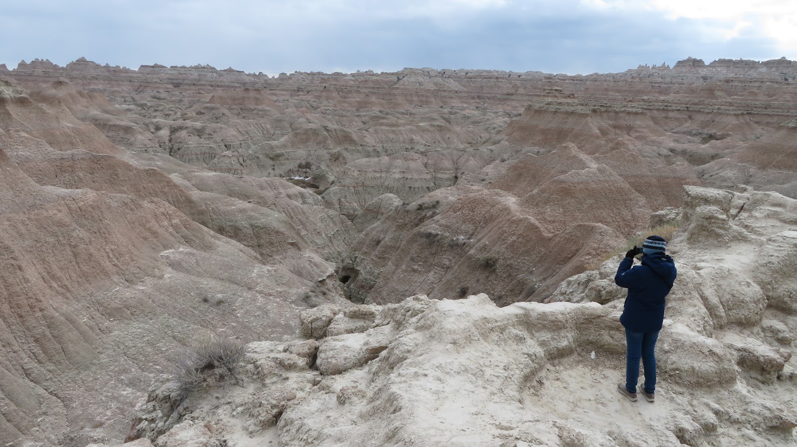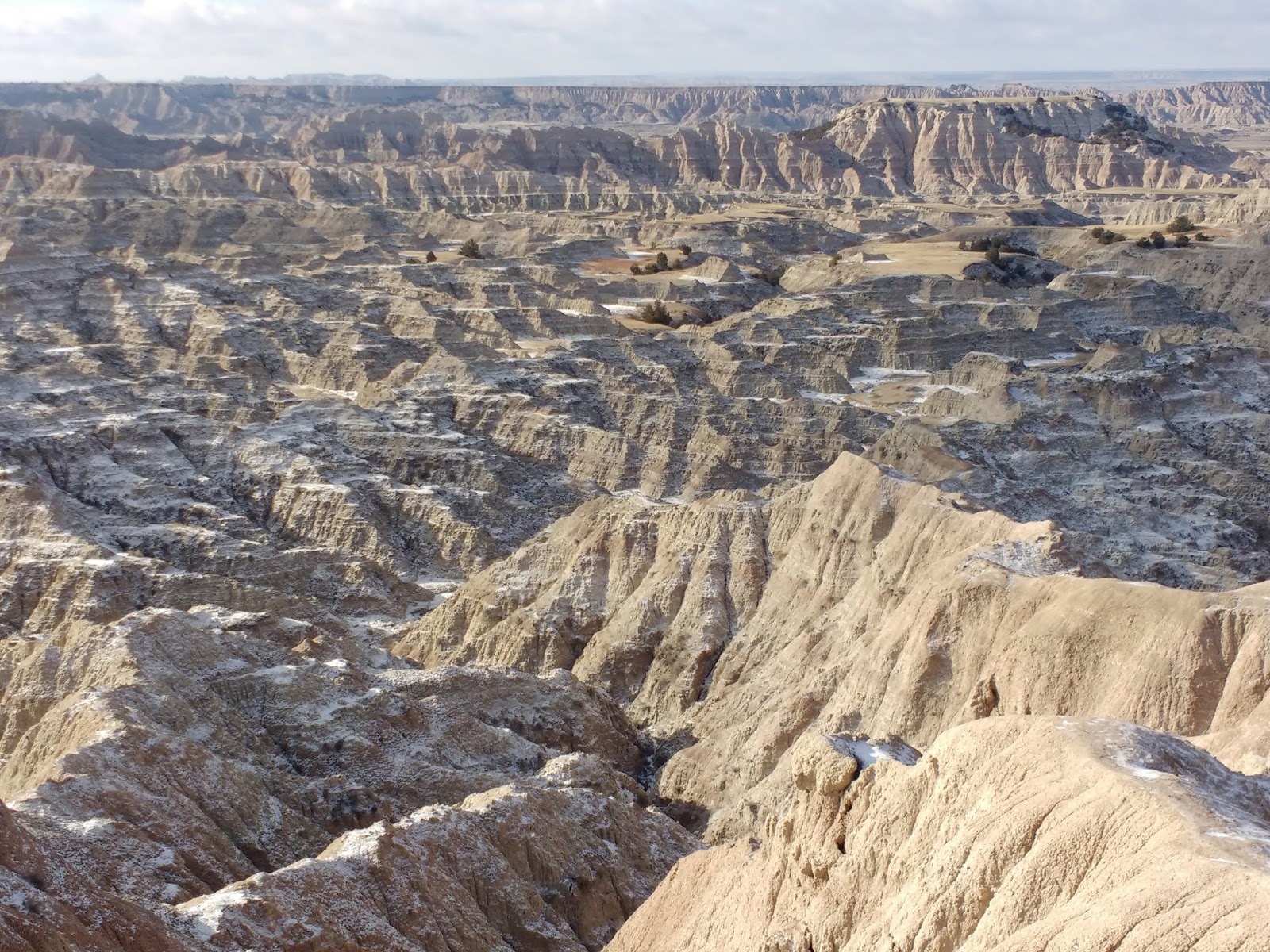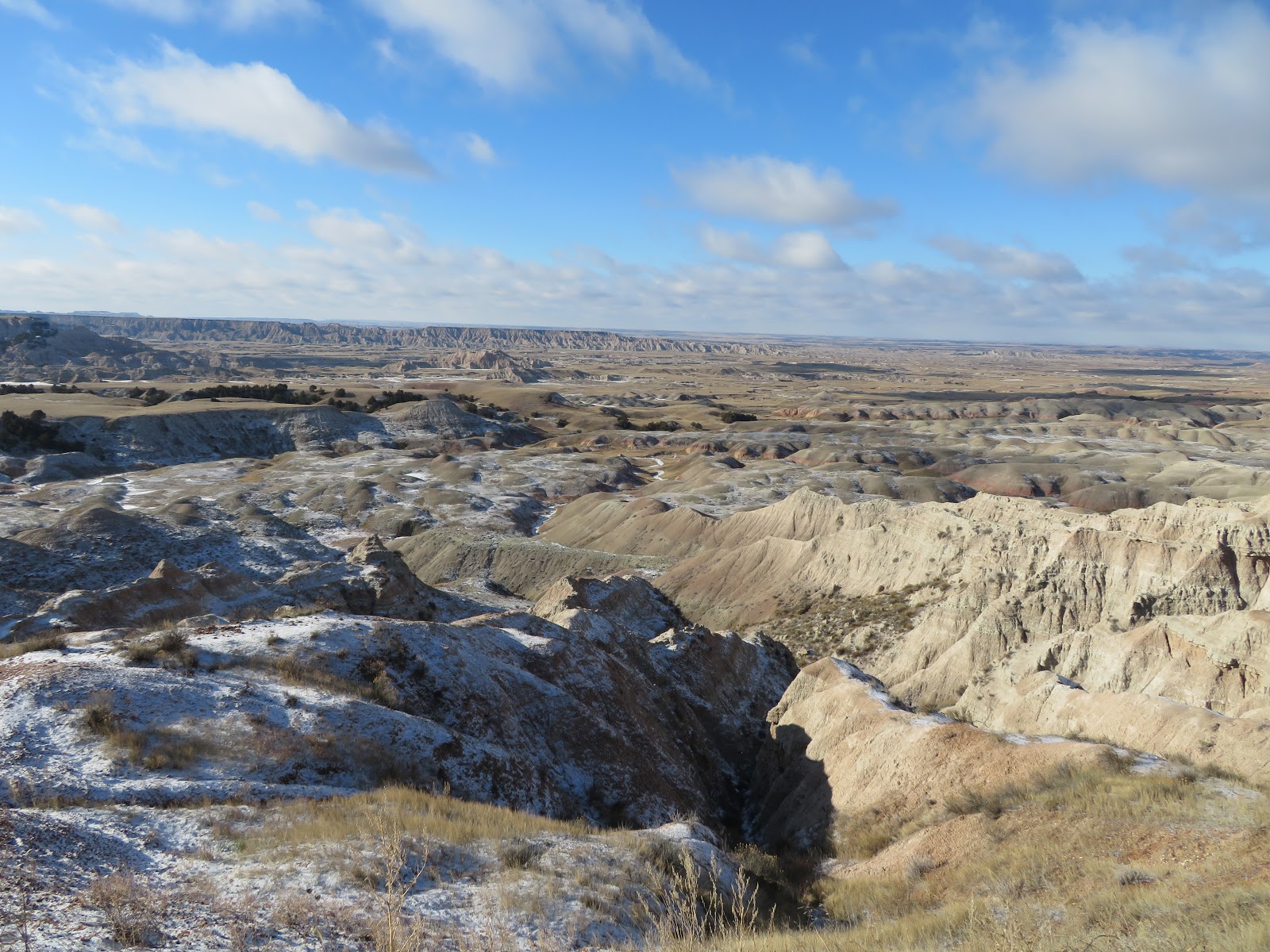 亮麗的陽光,遠眺的視野很好,微雪點綴的惡地岩層更加層次豐富,只是好冷。