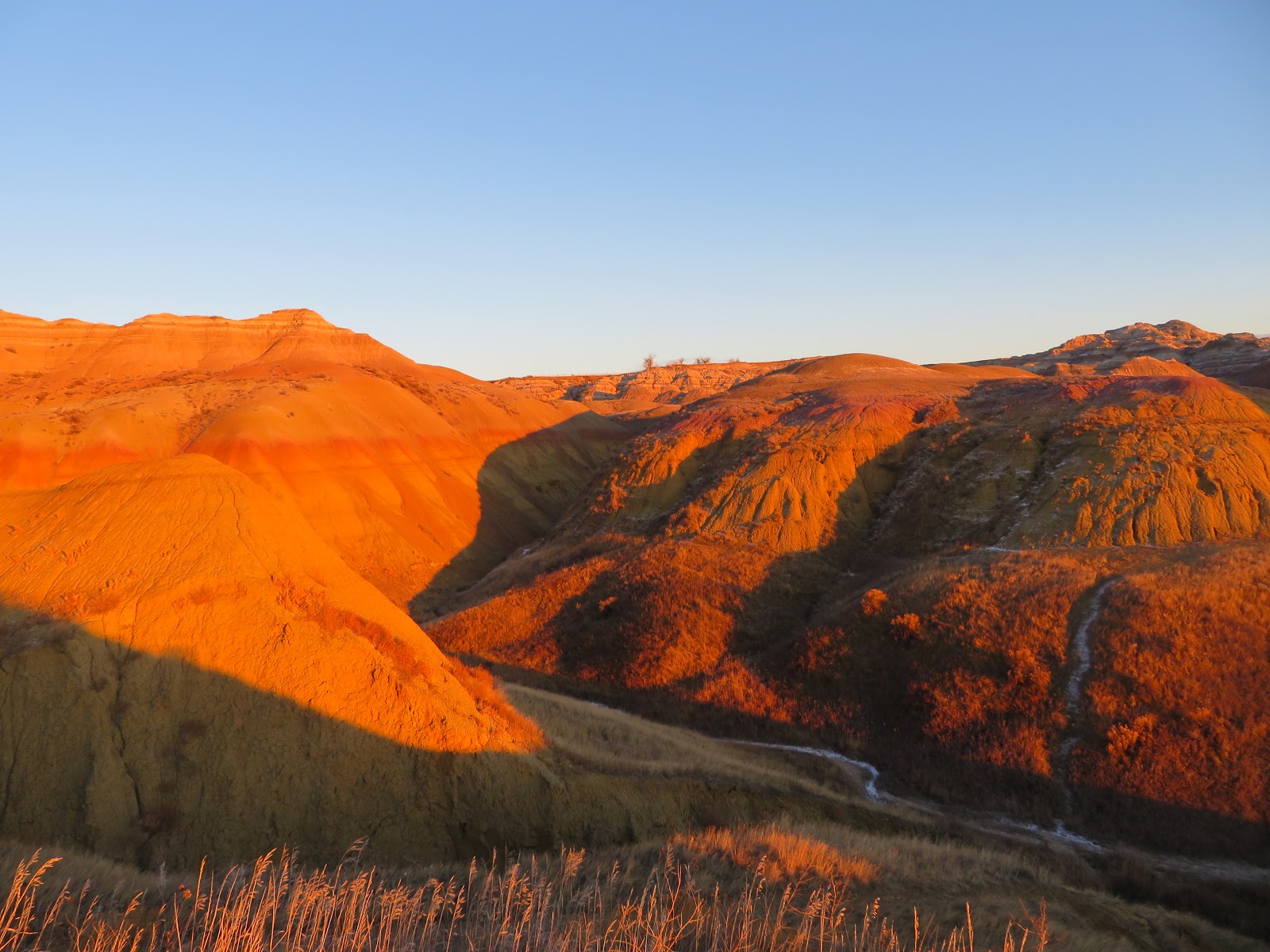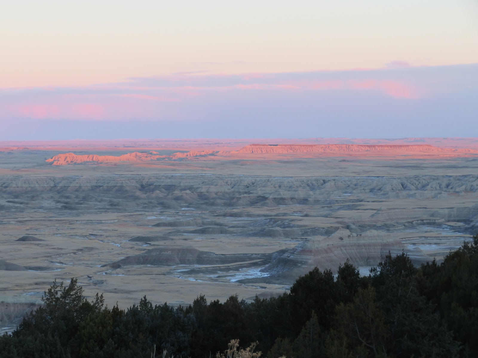 不可勝數的塔狀尖峰在夕照下,粉紅的亮光在Pinnacles上面閃耀。太陽西下天色已昏,只好在Badlands Loop road這條景觀公路上的最後一個景點結束這日行程。