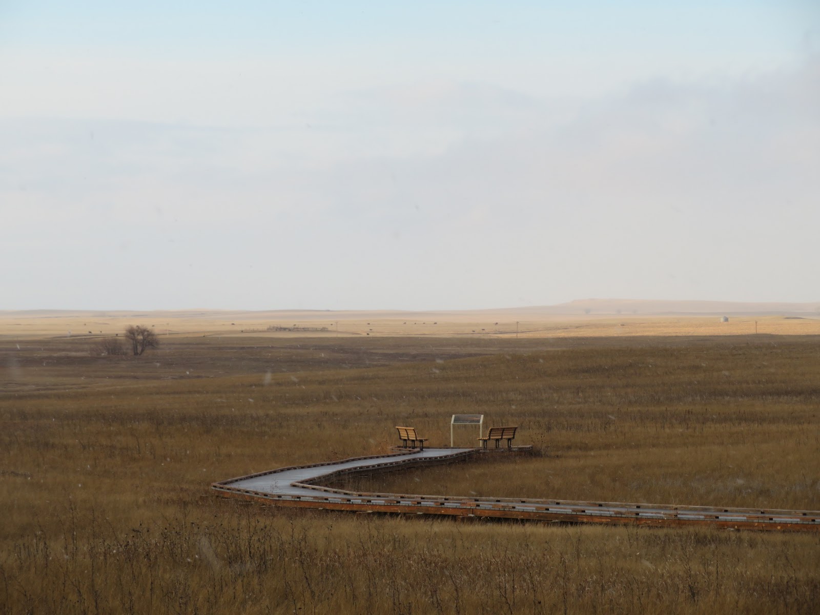以為有什麼野生動物在此漫步,我們在眺望點什麼也沒看到,感覺景色與緊鄰的Hay Butte Overlook差不多,只是距離草原比較近。但是在前往下一站Robert Prairie Dog Town的中途,在右邊草原上看到到水塘旁邊的幾隻美洲野牛,