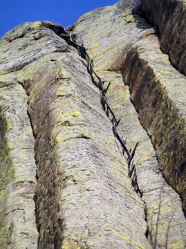 為人所知最早攀登的人是住在附近農場的William Rogers 和 Willard Ripley,他倆嘗試很多種方法,最後終於在1893年7月4日以木樁架起來的梯子攀登成功。上圖是國家公園管理局照片維基下載,從照片依稀可以想像他們大概是怎麼爬上去的,這些樁梯時至今日仍可見到。從那時以後約30年,許多攀登的人都用這個方法,直到梯子毀壞不能使用。1937年後,大多數的人都以現代化的攀登技巧攀登。1941年沒有申請攀登許可的喬治.霍普金斯George Hopkins 在眾人的驚呼聲中以降落傘炫技成功降落。但是接下來卻是一連串的糗事發生,首先是裝有繩索、斧頭和大錘的工具袋沒有掉在定點卻在邊緣滑落。後來再一次丟下工具包,但是天氣變壞風雨交加,繩索結凍糾纏無法使用。在經歷六天的飢寒交迫,終於喬治被曾經在1938年成功攀登魔鬼塔的Jack Durrance 領導的救援隊救下來。今日每年夏天吸引大量人潮攀登這片陡峭的岩壁,在眾多路徑中以1938年開闢的Durrance Route為最大眾化。攀登前需向公園申請許可,攀登後也要向公園報告,不能在岩頂上過夜必須當天來回。
