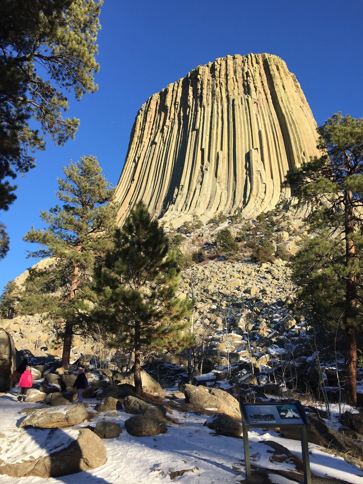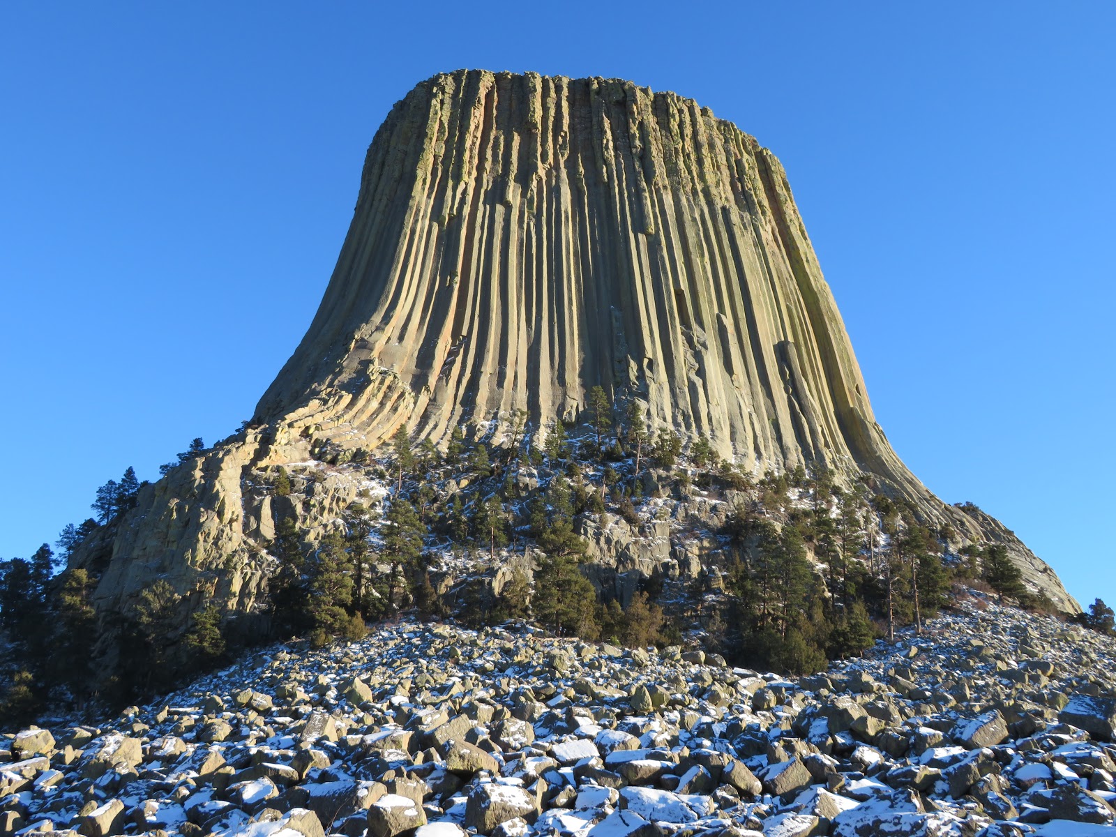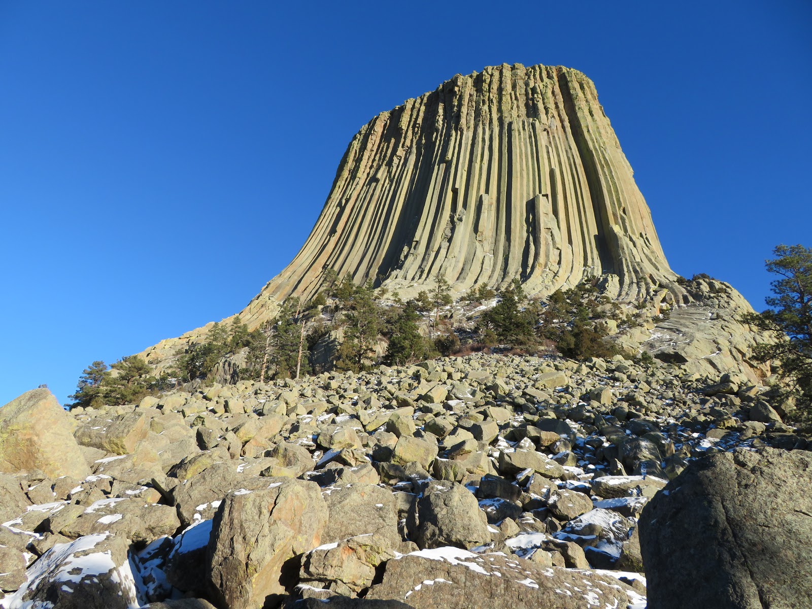 Tower Trail 沿著魔鬼塔底下走一圈,步道長2公里。走了約300公尺,發現步道上的雪雖然清理過,但是有點滑,此時魔鬼塔另一邊已有黑影子很難照相,於是又走回最主要的觀景點觀景。上面照片是2010年夏天所拍攝,地面無雪。