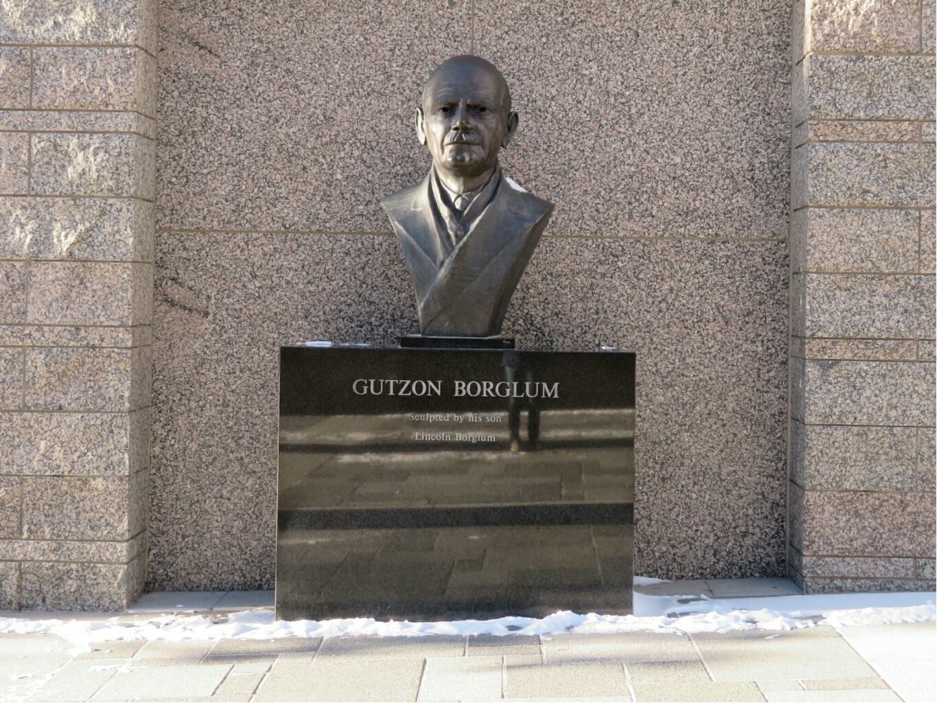 走到第二座門廊下面,看見格曾·博格勒姆 (Gutzon Borglum) 雕像以及當時參與雕刻的工作人員大理石鐫刻名錄。禮品店和吃的也在這裡。