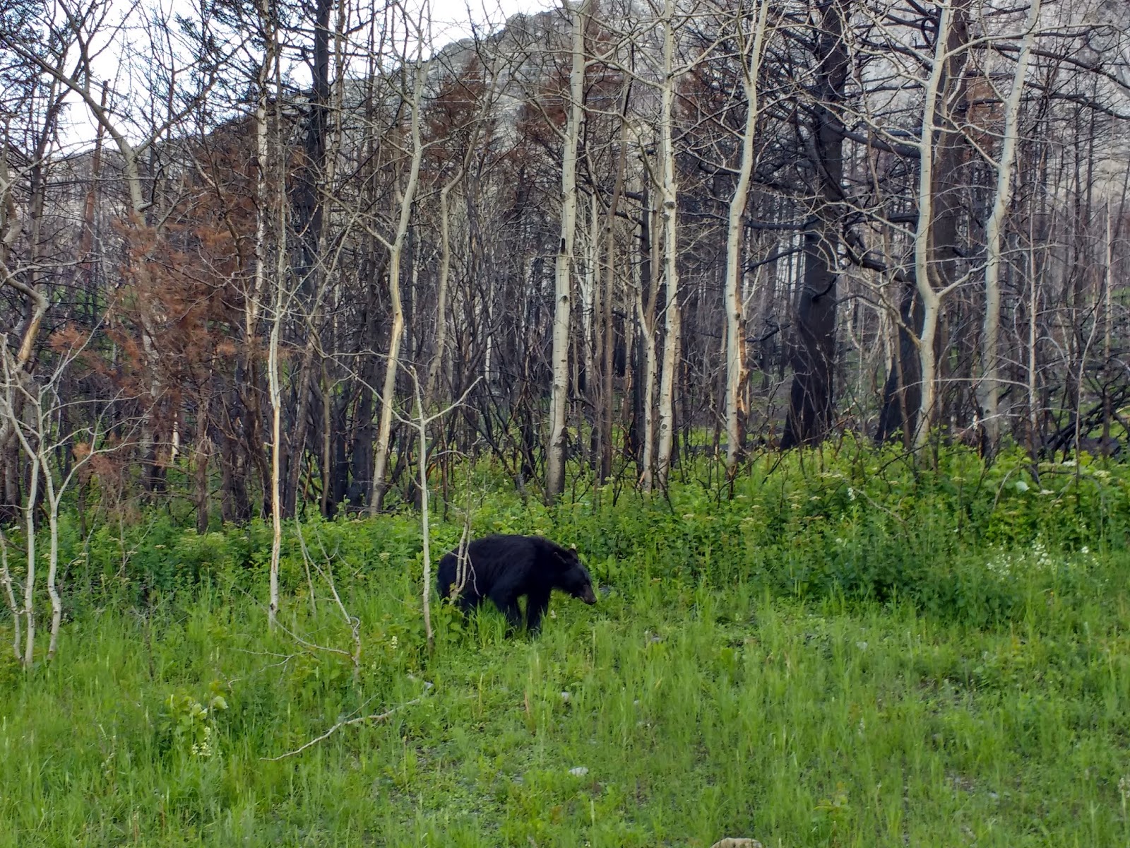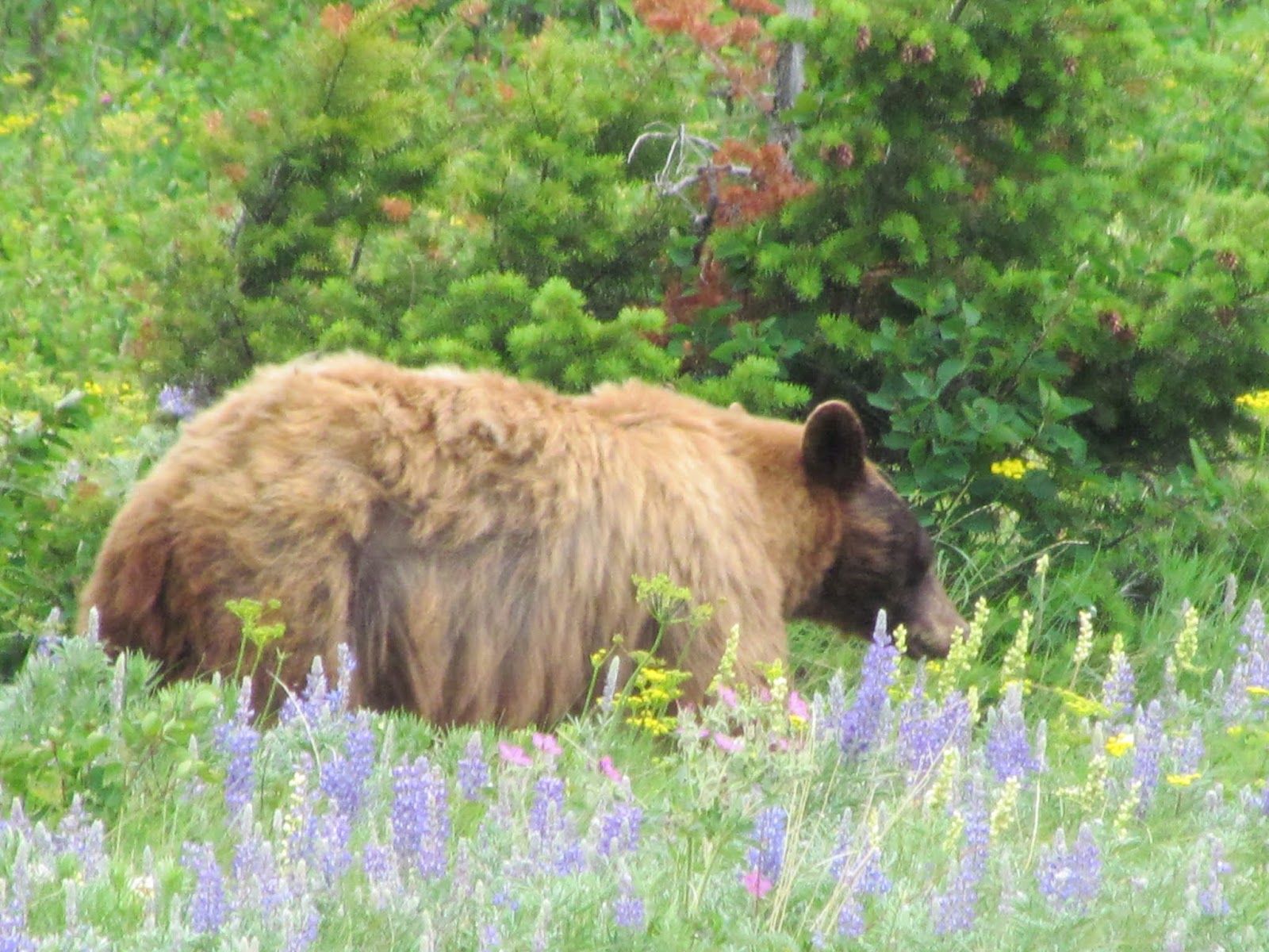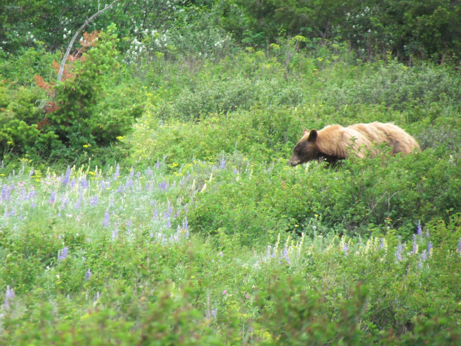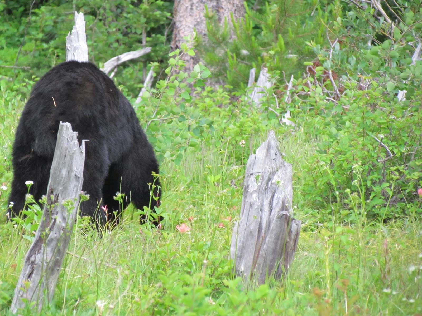 ⑤ 注意觀察,熊花很多時間在覓食上,所以走過有野莓漿果群聚的地方,有歐洲防風草 (cow parsnip) 的灌木叢或冰川百合 (glacier lily) 的草原要提高警覺。熊會做記號,所以看到樹皮被拉掉或者步道上的泥土被挖過也要特別注意。